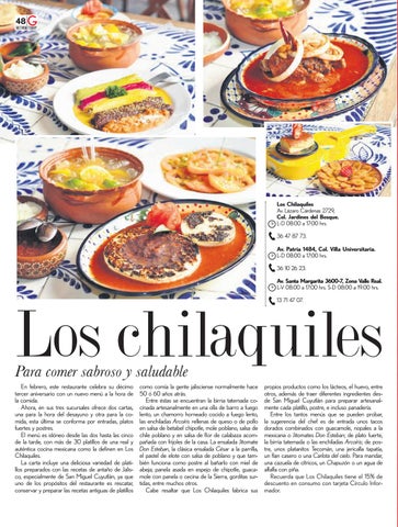 Los chilaquiles Para comer sabroso y saludable En febrero, este restaurante celebra su décimo tercer aniversario con un nuevo menú a la hora de la comida. Ahora, en sus tres sucursales ofrece dos cartas, una para la hora del desayuno y otra para la comida, esta última se conforma por entradas, platos fuertes y postres. El menú es idóneo desde las dos hasta las cinco de la tarde, con más de 30 platillos de una real y auténtica cocina mexicana como la definen en Los Chilaquiles. La carta incluye una deliciosa variedad de platillos preparados con las recetas de antaño de Jalisco, especialmente de San Miguel Cuyutlán, ya que uno de los propósitos del restaurante es rescatar, conservar y preparar las recetas antiguas de platillos