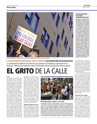 Acompañamiento de la PAH a entidades bancarias Afectados por la Hipoteca Madrid (PAH) y miembros de las asambleas del 15-M acompañaron esta semana a un afectado por desahucio para reclamar a la entidad bancaria Kutxa que se le condone la deuda de 115.000 euros a cambio de las llaves de su vivienda de Valdemoro. En 2006, Ronaldo Jiménez compró una vivienda en dicho municipio con una hipoteca por la que pagó 1.040 euros mensuales durante los tres primeros años. Pero se quedó sin empleo y, cuando la deuda ascendió a 5.000 euros, solicitó al banco una refinanciación, a la que éste se negó. Al parecer, Jiménez“encontró trabajo de guardia de seguridad que ahora desempeña, y la entidad ignoró su ofrecimiento de pagar la hipoteca con una mensualidad de 700 euros”. La entidad bancaria ha acabado quedándose con su casa, pero Ronaldo ha decidido abandonar su vivienda de forma voluntaria. Intento de desahucio frenado por vecinos, amigos y diferentes movimientos sociales en Leganés OLMO GONZÁLEZ/GENTE