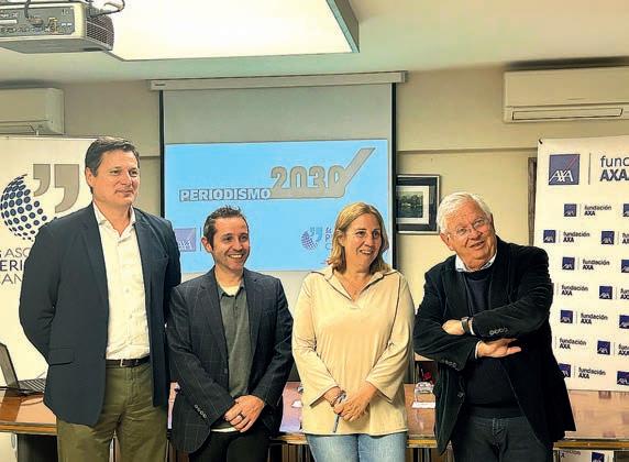 La presidenta de la Asociación de Periodistas de Cantabria (APC), Dolores Gallardo; Fernando Jáuregui y Sergio Martín, de Foro Periodismo 2030, y el director general de Fundación AXA, Josep Alfonso Caro, presentaron esta segunda encuesta, cuyo trabajo de campo concluyó a nales de diciembre de 2022, el martes, en rueda de prensa en Santander.
