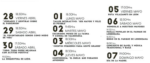 mayo, taller ‘Ser mayor y feliz es posible’; el martes 2, excursión al Museo de la Fauna deVadehuesa;el miércoles 3, cuentos para gente grande; el jueves 4, conferencia sobre el duelo y el viernes 5, Ruta Vela Zanetti.