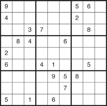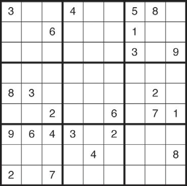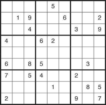 Sudoku Completa el tablero rellenando las celdas vacías con los números del 1 al 9 sin repetir ninguna cifra en cada fila ni en cada columna o cuadrado.