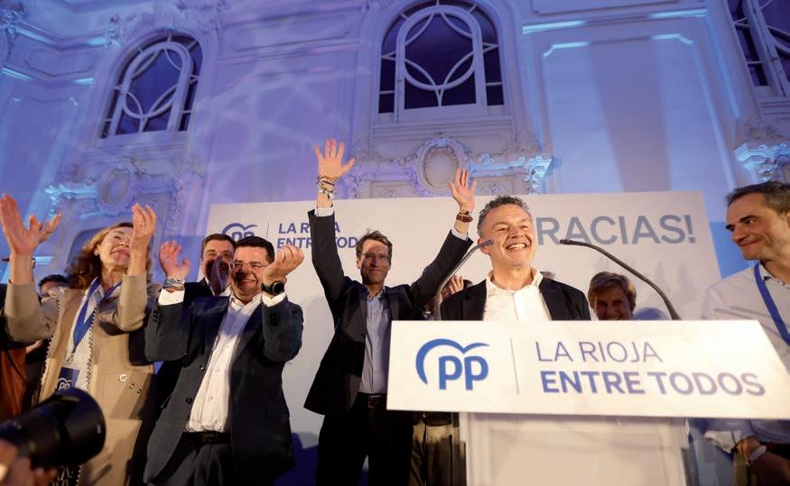 Ángel Íñiguez, candidato a la presidencia, y Eduardo Peña, a la alcaldía de Logroño, asumieron el fracaso: “Necesitamos una formación de centro liberal que nos aleje de los extremismos, aunque nosotros sufrimos un gran deterioro de la marca y nuestros votantes seguramente se fueran a alternativas más útiles. Sabíamos que nos arriesgábamos a estos resultados”. Para las generales, Ciudadanos anunció que no concurrirá el 23-J, lo que de facto signi ca su defunción. Vox fue el otro triunfador, aunque sin margen de decisión, dadas las mayorías absolutas del PP. En La Rioja obtuvo dos escaños, para Ángel Alda y Héctor Alacid, y en Logroño, otros dos ediles, para María Jiménez y Patricia González Lacarra: “Echamos a la izquierda. Ahora, nos toca ejercer una labor de vigilancia”. Arranca un nuevo ciclo regional, teñido de azul. Y el 23-J, plebiscito en España para calibrar entre la gura de Pedro Sánchez o la pujanza popular.