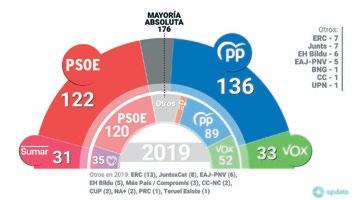Vox se quedan en 169 escaños,a 7 de la mayoría absoluta que solo lograrían con PNV (5), UPN (1) y Coalición Canaria (1). Pero parece imposible juntar en un pacto a PNV y CC con Vox. Parecida dificultad tiene Pedro Sánchez, que con Sumar se queda en 153. Sin embargo, añadiendo a ERC (7), JxCat (7), EH Bildu (6) y PNV (5) superan la cifra mágica de 176 en que está establecida la mayoría abosoluta. Incluso podrían llegar a los 179 votos si se incorpora tambén el diputado del BNG.Pero también aquí está difícil por-