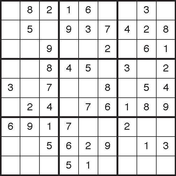 Complete el tablero de 81 casillas (dispuestas en 9 filas y columnas). Deberá rellenar las celdas vacías con los números que van del 1 al 9, de modo que no se repita ninguna cifra en cada fila ni en cada columna o cuadrado.