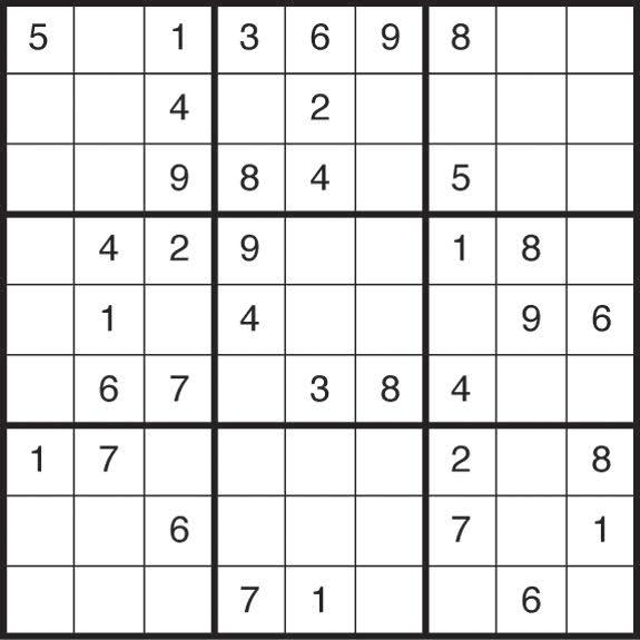 Complete el tablero de 81 casillas (dispuestas en 9 filas y columnas). Deberá rellenar las celdas vacías con los números que van del 1 al 9, de modo que no se repita ninguna cifra en cada fila ni en cada columna o cuadrado.