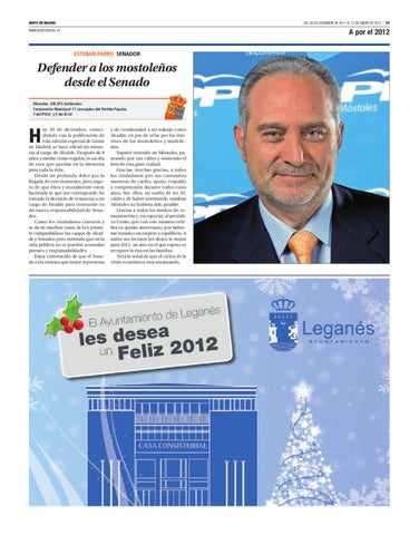 y da continuidad a mi trabajo como Alcalde, en pro de velar por los intereses de los mostoleños y madrileños. Seguiré viviendo en Móstoles, paseando por sus calles y sintiendo el latir de esta gran ciudad. Gracias, muchas gracias, a todos los ciudadanos por sus constantes muestras de cariño, apoyo, respaldo y comprensión durante todos estos años. Sin ellos, mi sueño de ser Alcalde y de haber intentando cambiar Móstoles no hubiera sido posible. Gracias a todos los medios de comunicación y, en especial, al periódico Gente, que con este número celebra su quinto aniversario, por haberme tratado con respeto y equilibrio. A todos sus lectores les deseo lo mejor para 2012, un año en el que espero se recupere la risa en las familias. Será la señal de que el ciclón de la crisis económica está amainando.