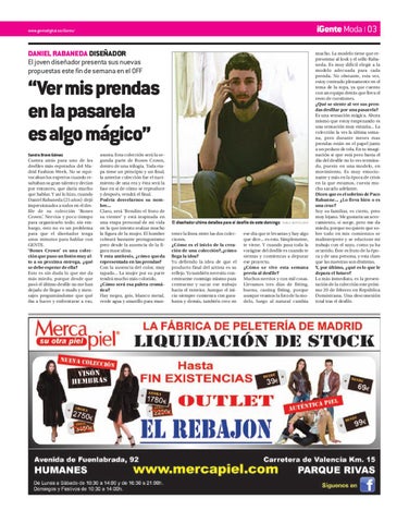 mucho. La modelo tiene que representar al look y el sello Rabaneda. Es muy difícil elegir a la modelo adecuada para cada prenda. No obstante, esta vez, estoy centrado plenamente en el tema de la ropa, ya que cuento con un equipo detrás que lleva el resto de cuestiones. ¿Qué se siente al ver sus prendas desfilar por una pasarela? Es una sensación mágica. Ahora mismo que estoy empezando es una sensación muy extraña... La colección la ves la última semana, pero durante meses esas prendas están en el papel junto a un pedazo de tela. En tu imaginación si que está pero hasta el día del desfile no lo ves terminado, puesto en una modelo, en movimiento. Es muy emocionante y más en la época de crisis en la que estamos, cuesta mucho sacarlo adelante. Dicen que es el sobrino de Paco Rabanne... ¿Lo lleva bien o es una cruz? Soy su familiar, es cierto, pero muy lejano. Me gustaría un acercamiento, si surge, pero me da miedo, porque no quiero que sobre todo en mis comienzos se malinterprete y se relacione mi trabajo con el suyo, como ya ha ocurrido. Éste es fruto de la época y de una persona, y esta claro que las nuestras son distintas. Y, por último, ¿qué es lo que le depara el futuro? Lo más inmediato, es la presentación de la colección este próximo 20 de febrero en República Dominicana. Una desconexión total tras el desfile.