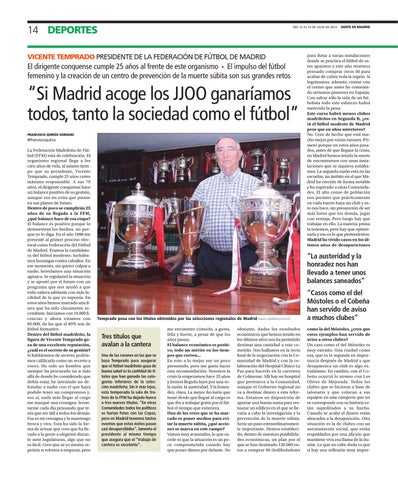“Casos como el del Móstoles o el Cobeña han servido de aviso a muchos clubes” como la del Móstoles, ¿cree que estos ejemplos han servido de aviso a otros clubes? Un caso como el del Móstoles es muy extraño. Una ciudad como esa, que es la segunda en importancia después de Madrid y que desaparezca un club es algo extrañísimo. En cambio, con el Cobeña ocurrió lo mismo con Los Olivos de Mejorada. Todos los clubes que se hicieron a base de talonario y que colocan a sus equipos en una categoría que no se corresponde con su historia están supeditados a su hucha. Cuando se acaba el dinero están abocados a la desaparición. Otra situación es la de clubes con un asentamiento social, que están respaldados por una afición que mantiene viva esa llama de la ilusión. Lo que no cabe duda es que sí hay una reflexión muy impor-