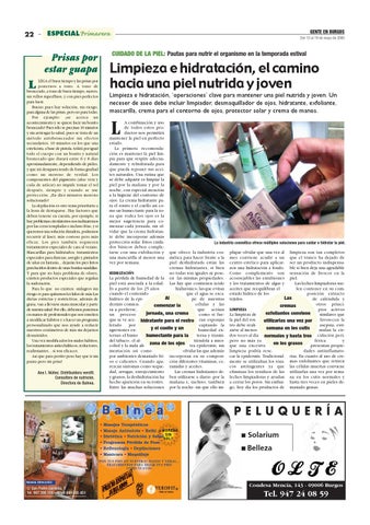 que ofrece la industria cosmética para hacer frente a la piel deshidratada están las cremas hidratantes, si bien no todas son iguales ni poseHIDRATACIÓN La pérdida de humedad de la en las mismas propiedades. piel está asociada a la edad. Las hay que contienen ácido hialurónico, las que evitan Es a partir de los 25 años que el agua se escacuando el contenido Al pe de nuestras hídrico de la epicélulas y las dermis comiencomenzar la que actúan za a perderse, jornada, una crema como si fueun proceso que se ve ace- hidratante para el rostro ran esponjas captando la lerado por y el cuello y un humedad exagresiones externa y trasmiternas -el humo humectante para la tiéndola a nuesdel tabaco-, el alzona de los ojos tra epidermis; sin cohol y la mala aliolvidar las que además mentación así como por ambientes demasiado frí- incorporan en su composios o calientes. Cuando apa- ción diferentes vitaminas, cerezcan síntomas como seque- ramidas y aceites. Las cremas hidratantes dedad, arrugas, enrojecimiento y granos, la deshidratación ha ben utilizarse a diario -por la hecho aparición en su rostro. mañana e, incluso, también Entre las muchas soluciones por la noche- sin que ello im-