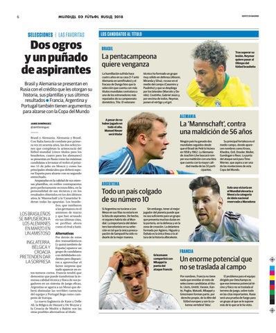Dos ogros y un puñado de aspirantes Brasil y Alemania se presentan en Rusia con el crédito que les otorgan su historia, sus plantillas y sus últimos resultados Francia, Argentina y Portugal también tienen argumentos para alzarse con la Copa del Mundo