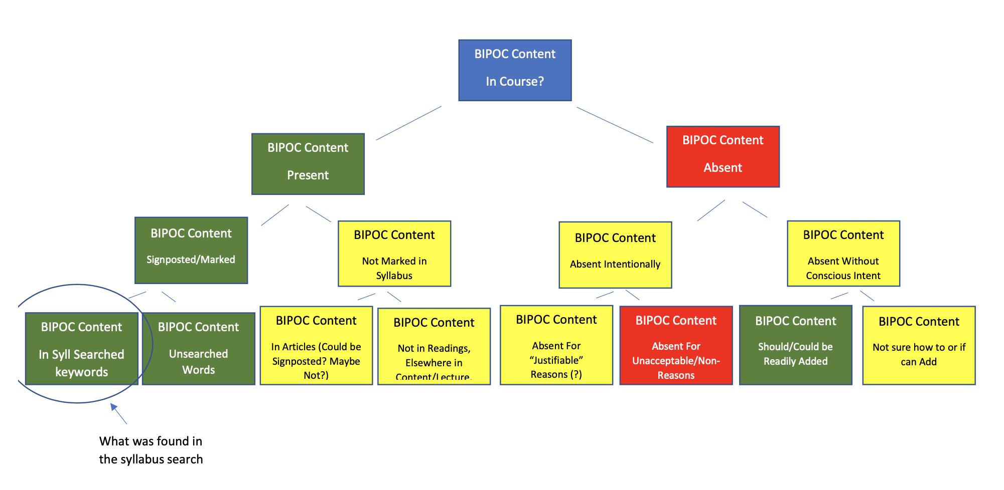 Syllabi for all core courses, concentration gateway courses, and JPG (Joint Geography-Planning) elective courses were assembled, going back fve years. Kuni Kamizaki prepared a course mapping tool, through which to identify where in the curriculum “relevance to practice” sits in relation to “critical thinking about planning and the world,” and how courses have transitioned over the last fve years. Hazel Valenzuela prepared a tool for analyzing antiBlack racism content in all PLA and JPG courses, which allowed us to assess course titles, course themes and course readings through a critical-race lens; the tool seeks to explore how and whether Anti-Black racism and anti-racism content is concentrated in particular courses, and/or embedded throughout the curriculum.1 Jason Spicer prepared a decision tree for assessing BIPOC content in courses, through which we could assess whether and when BIPOC content is signposted and/or absent, with and without the conscious intent of the instructor; this tool was designed for use by individual instructors when planning their courses. See Appendix 3 for review tools