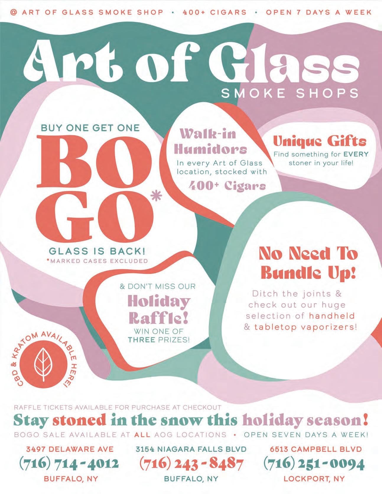 42 Allen Street • Buffalo, NY 716-881-0537 • localsmokeshop@aol.com local.smokeshop localsmokeshop OPEN 7 DAYS A WEEK! LOCAL & NAME BRAND GLASS CBD PRODUCTS • HEMP FLOWER • KRATOM WRAPS, CIGARILLOS, PAPERS & CIGARS APPAREL • GIFT & NOVELTY ITEMS 716.549.0393 VILLAGE1STOPSMOKESHOP@AOL.COM 11 COMMERCIAL STREET • ANGOLA, NY 14006 Village One-Stop Smoke Shop THE ONE-STOP SMOKE SHOP FOR ALL YOUR SMOKING NEEDS VILLAGE1STOPSMOKESHOP 15 WINTER 2023 | CannaBuff.com