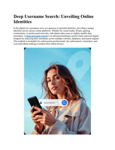In the digital era, usernames serve as a gateway to personal identities, providing a unique identifier across various online platforms. Whether for social media, forums, gaming communities, or professional networks, individuals often reuse or slightly modify their usernames. A deep username search is an advanced technique used to track a person's digital footprint by analyzing their usernames across multiple websites, databases, and search engines. This method is invaluable for cybersecurity professionals, law enforcement, researchers, and even individuals seeking to reclaim their online privacy.