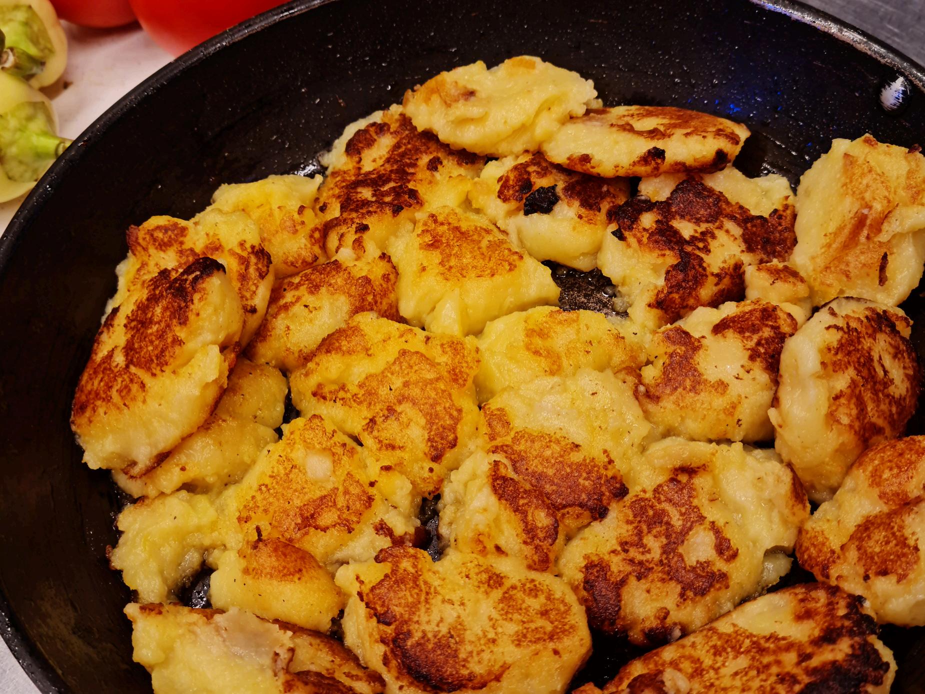 Traditionally, the dumplings are fried in lard with onions until they turn golden brown, creating a crispy exterior while remaining soft inside. They can be served as a main dish or a side dish, often topped with sour cream or crispy bacon bits for added flavor.