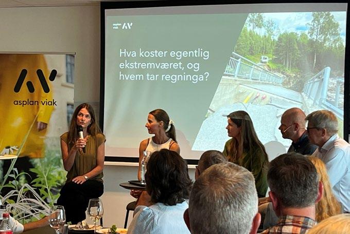 Hva kostet egentlig ekstremværet og hvem tar regningen? Asplan Viak inviterte til samtale og servering i egne lokaler. Med i samtalen var Ståle Navrud - Professor i miljø- og ressursøkonomi ved Handelshøyskolen, NMBU, Hans Kortner Ryen - Kommunalsjef teknisk, Midt-Telemark kommune, Ajla Alagic - Bærekraftsansvarlig eiendom, Gjensidige forsikring, Kristin Karlbom Dahle - Arealplanlegger, Asplan Viak Nora Skarre AbrahamsenTjenestedesigner, Asplan Viak, Birgitte Dørum - Leder kommunikasjon, Asplan Viak Ordstyrer. Foto Marianne Meinich.