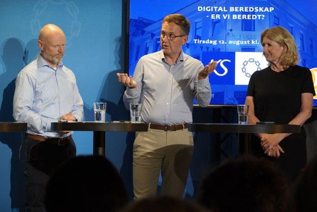 Digital beredskap – er vi beredt? Landdirektør Knut Bjørgaas fra Kartverket (midten) deltok i debatten med blant annet direktør Roar Olsen fra Statens graderte plattformtjenester (SGP), og direktør Christine Bergland fra Folkehelseinstituttet. Foto: Sissel Kanstad / Kartverket