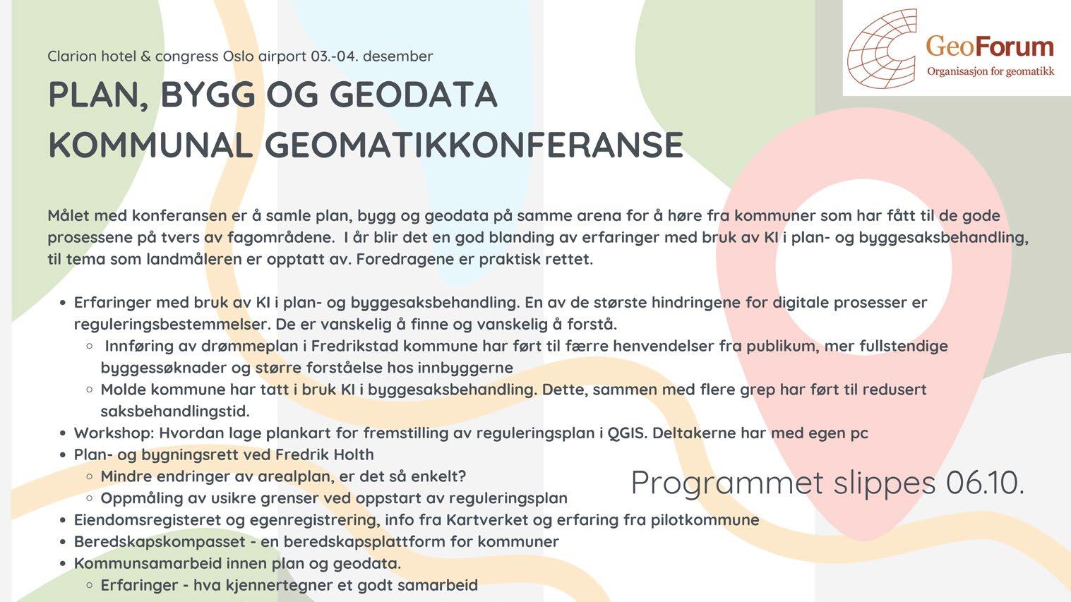 Konferansen har praktisk rettede foredrag innen plan, bygg og geodata. På årets konferanse blir det mer om erfaringer med bruk av KI i plan- og byggesaksbehandling, eksempler fra kommunesamarbeid, workshop; hvordan lage plankart i QGIS, mer om arealoverføring, veilederen om privat avtale om grenser og beredskapskart, for å nevne noe. Programmet er straks klart.