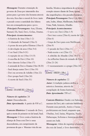 Livro: 2SAMUEL (2Sm) Número de capítulos: 24 Autor: Desconhecido. Data Aproximada: A partir de 930 a.C. Contexto Histórico: O reinado de Davi, após a morte do primeiro rei de Israel, Saul. Mensagem: O livro conta a história da aliança de Deus com Davi e seus descendentes, em cumprimento da promessa de que o Messias viria de sua