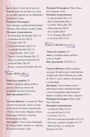 que a vitória ou derrota de um povo depende muito de seu líder. Já o êxito de um líder depende de sua fidelidade e obediência a Deus. Principais Personagens: Davi, Salomão, a rainha de Sabá, Roboão, Jeroboão, Elias, Eliseu, Jezabel, Acabe. Principais Acontecimentos: - A entronização de Salomão (1Rs 1-3) - A sabedoria do Rei (1Rs 3) - O Templo (1Rs 5-8) - A fama de Salomão (1Rs 9-10) - A queda de Salomão (1Rs 11) - O reino dividido (1Rs 12-22) - Elias e a viúva de Sarepta (1Rs 17) - Elias e os profetas de Baal (1Rs 18) - A fuga de Elias (1Rs 19) - Eliseu, o sucessor do profeta (1Rs 19)