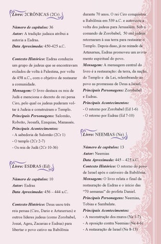 durante 70 anos. O rei Ciro conquistou a Babilônia em 539 a.C. e autorizou a volta dos judeus para Jerusalém. Sob o comando de Zorobabel, 50 mil judeus retornaram à sua terra para restaurar o Templo. Depois disso, já no reinado de Artaxerxes, Esdras promoveu um avivamento espiritual do povo. Mensagem: A mensagem central do livro é a restauração: da terra, da nação, do Templo e da Lei, relembrando ao povo as promessas de Deus a Israel. Principais Personagens: Zorobabel e Esdras. Principais Acontecimentos: - O retorno por Zorobabel (Ed 1-6) - O retorno por Esdras (Ed 7-10)