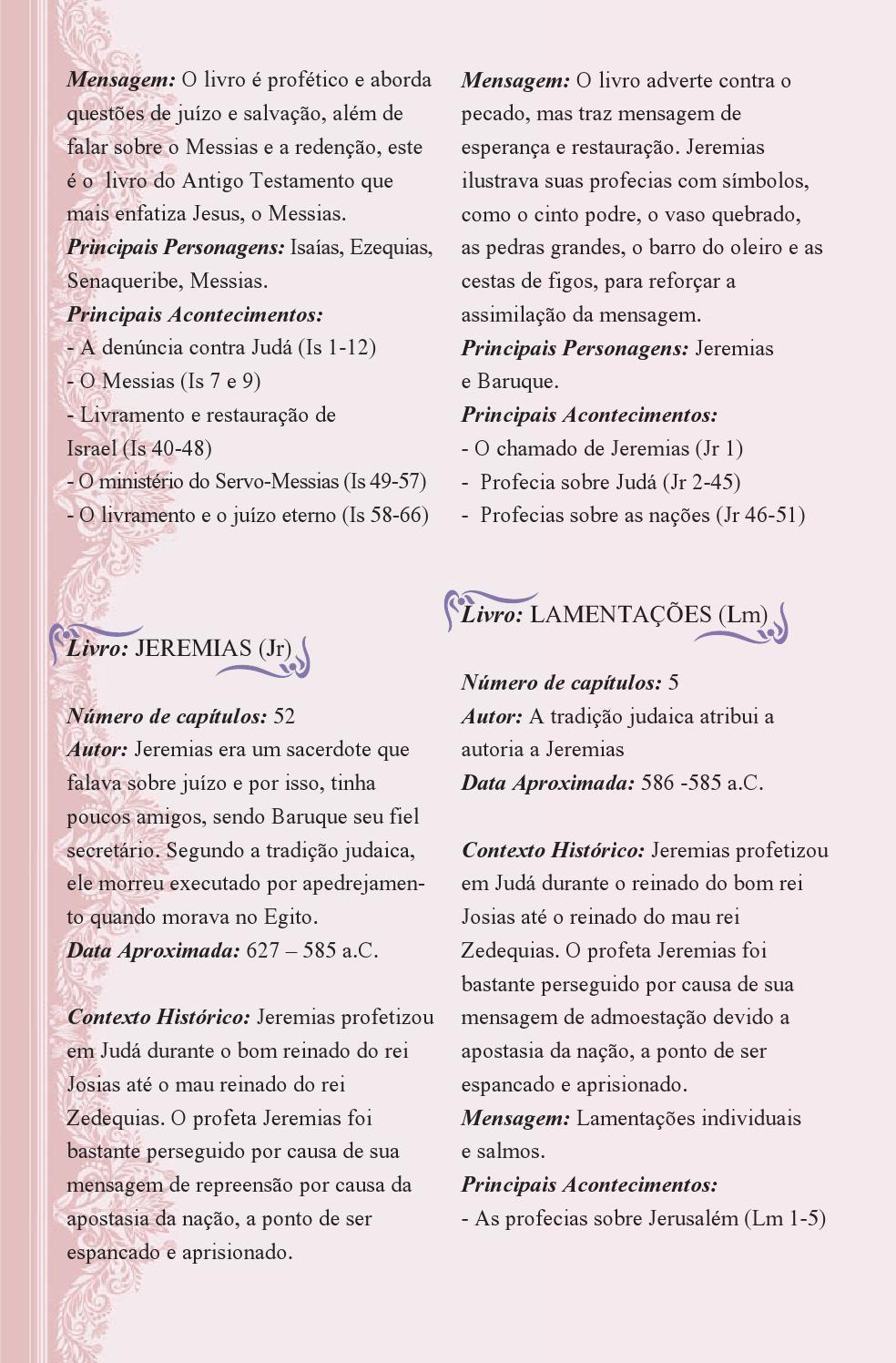 Mensagem: O livro adverte contra o pecado, mas traz mensagem de esperança e restauração. Jeremias ilustrava suas profecias com símbolos, como o cinto podre, o vaso quebrado, as pedras grandes, o barro do oleiro e as cestas de figos, para reforçar a assimilação da mensagem. Principais Personagens: Jeremias e Baruque. Principais Acontecimentos: - O chamado de Jeremias (Jr 1) - Profecia sobre Judá (Jr 2-45) - Profecias sobre as nações (Jr 46-51)