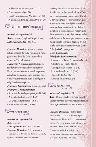 Mensagem: Josué era um homem de fé e de guerra. Foi escolhido por Deus para, junto ao povo, conquistar Canaã. O povo de Deus foi alertado para não se envolver com a religião cananita, que envolvia prostituição, idolatria e sacrifício a falsos deuses. Porém, eles desobedeceram e não destruiram todos os habitantes da terra, por isso acabaram incorporando costumes pagãos, prejudicando o seu relacionamento com Deus. Principais Personagens: Josué, Raabe, Acã. Principais Acontecimentos: - A entrada na Terra Prometida (Js 1-5) - A história de Raabe (Js 2) - A conquista de Canaã (Js 6-12) - As muralhas de Jericó (Js 6) - O pecado de Acã (Js 7) - A morte de Josué (Js 24)