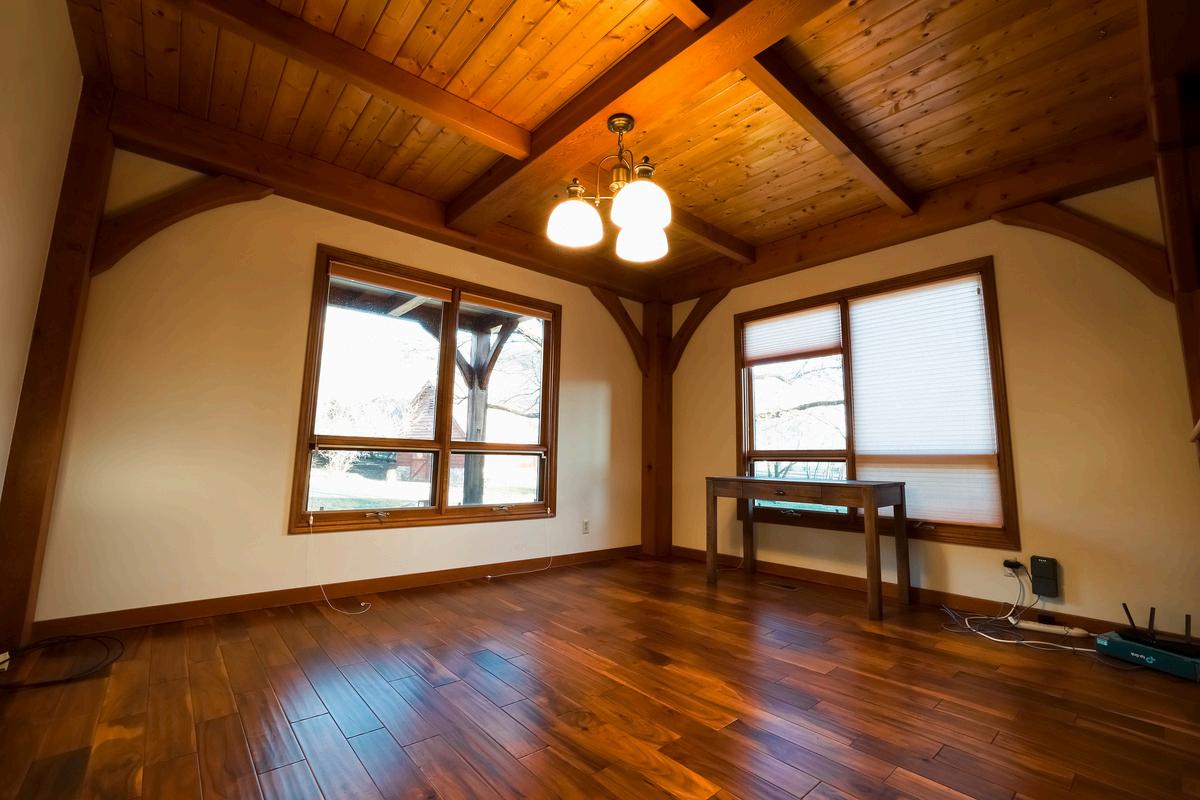 This room is on the east side of the main floor, has lots of natural light, and could be used as either an open office/library or a dining room.