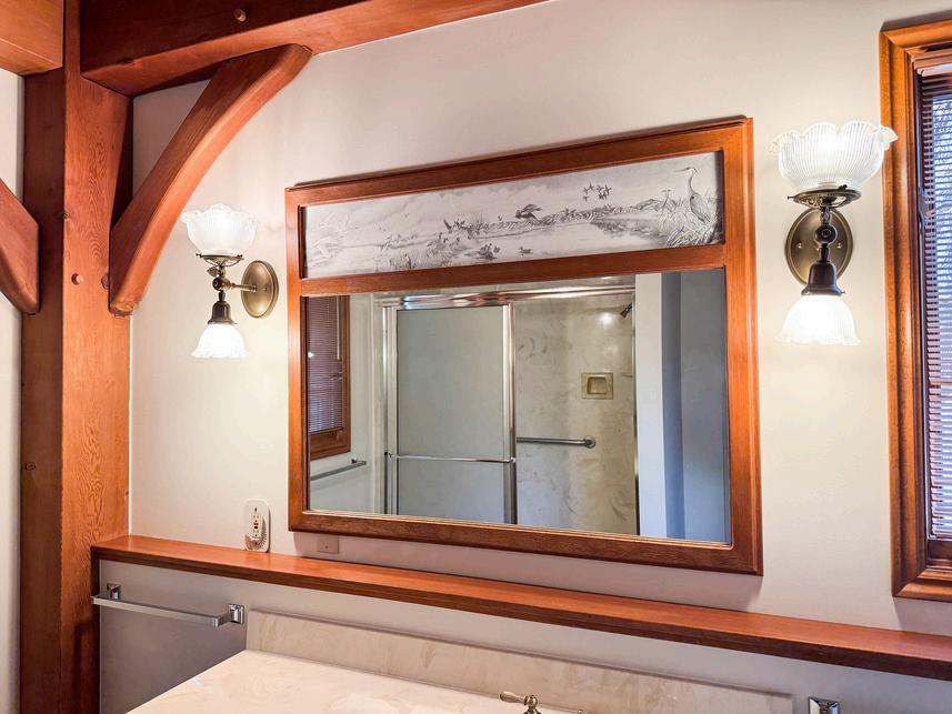 This bathroom has an artist’s rendering of a Bear River wetland and native birds above the large mirror.