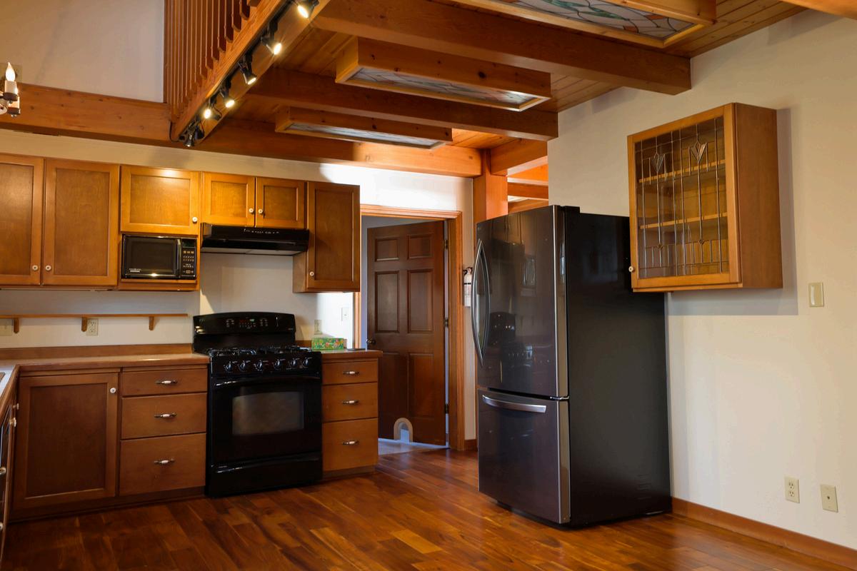The kitchen has a great view into the backyard. A skylight provides additional natural light. The door to the backyard deck is just outside of this image. The buyer has the option to keep the refrigerator which is less than a year old.