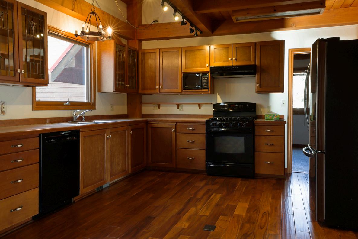 The lower-level kitchen with integrated breakfast counter/storage.