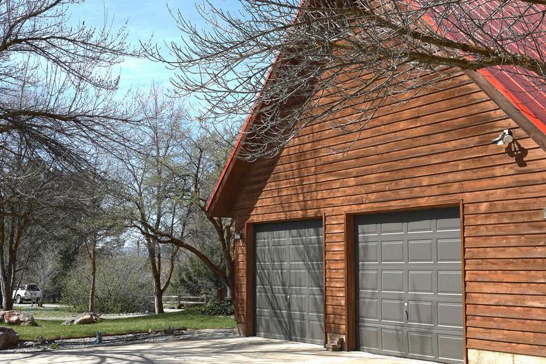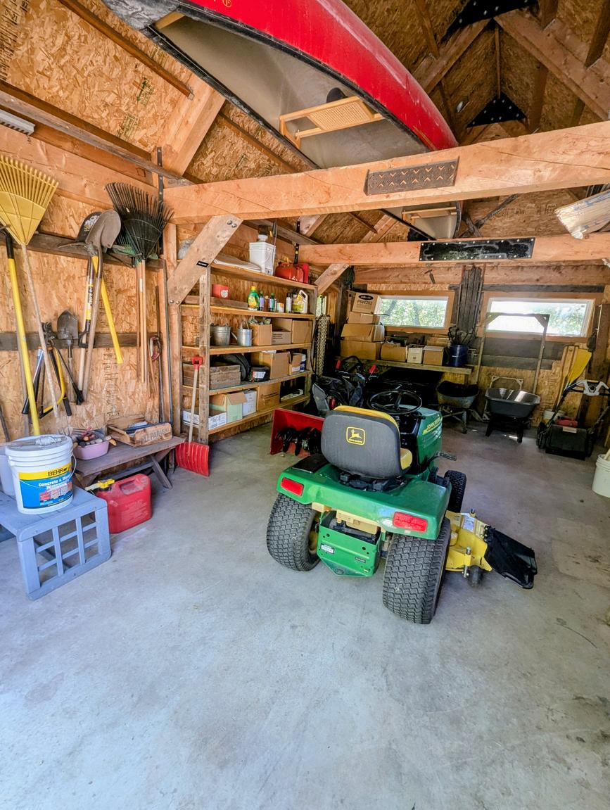 The small barn has a concrete floor, provides storage space, and could also serve as an unattached garage. Note the space next to the barn that could be used for either an additional garden plot or a place for a chicken coop/run.