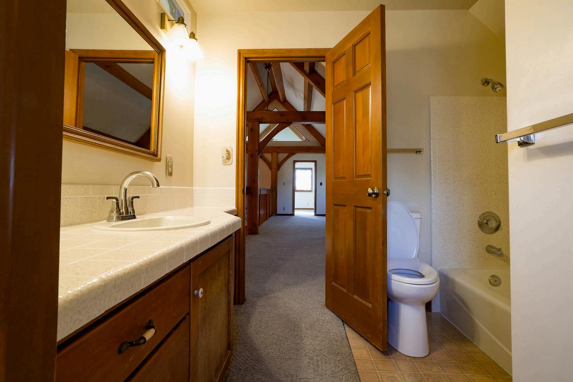 The upper-level bathroom is connected to the master bedroom on the east side of the house.