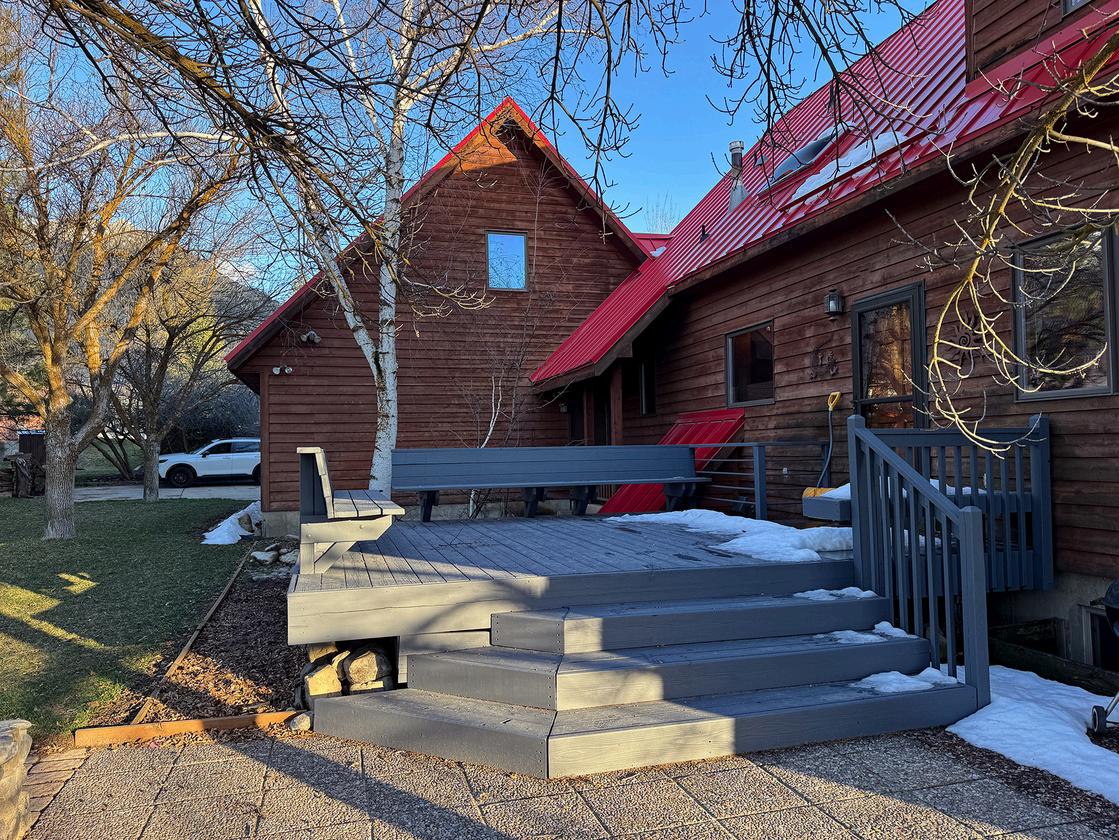 The back deck on the north side of the house is protected from the hot summer sun. The adjacent stone patio offers even more space for a bbq, hammock, and plants.