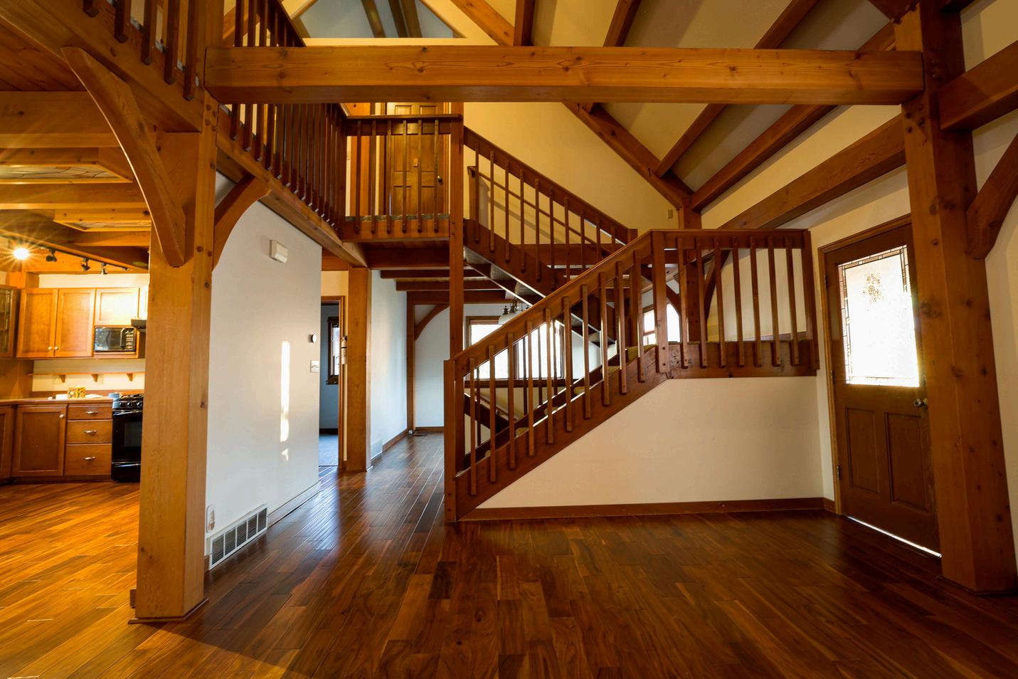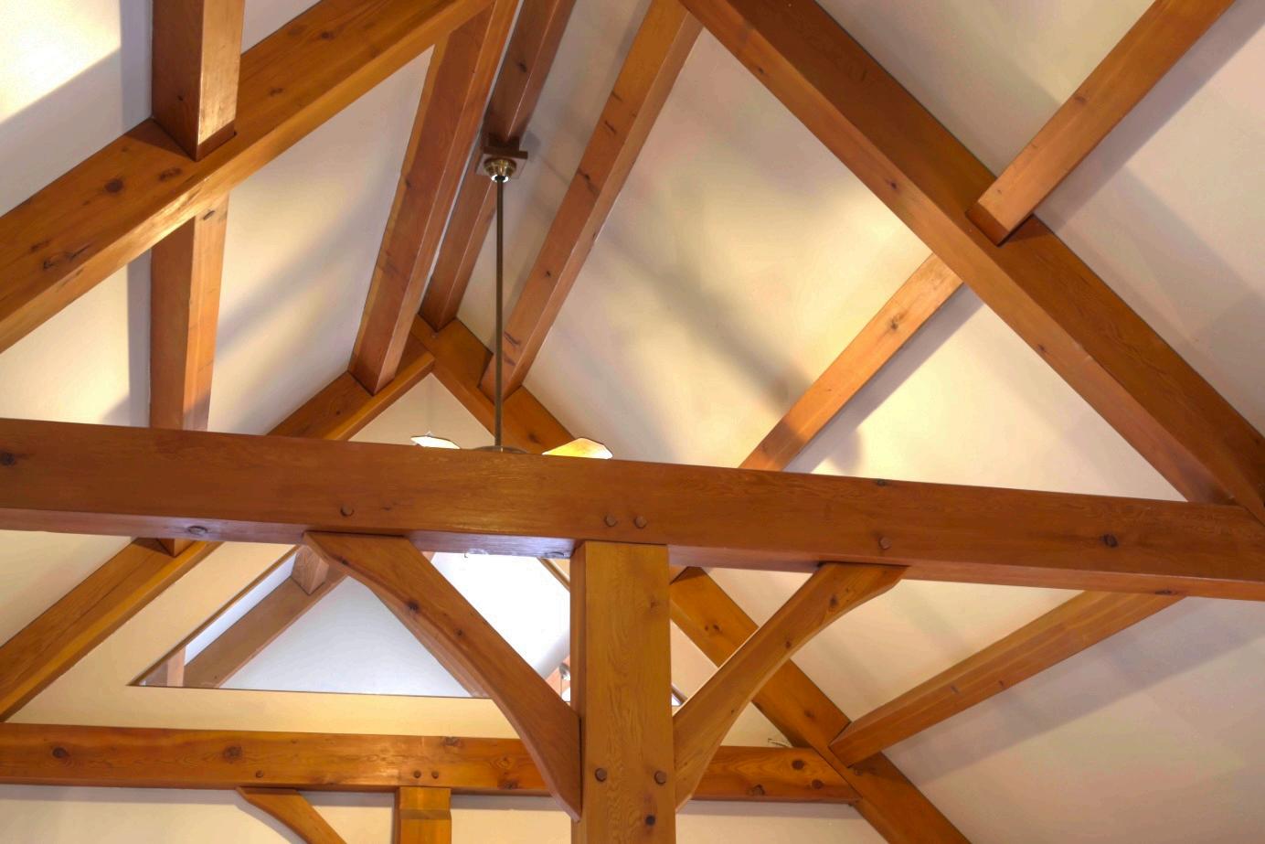 A hallmark of timber frame* (TF) houses is the use of traditional, mortise-and-tenon craftsmanship (interlocking wood joints secured with wooden pegs). These allwood connections not only create unique aesthetic appeal, but they also result in exceptional longevity, strength against seismic activity, high storm durability, lower insurance rates, and lower long-term maintenance costs relative to traditional stick frame (SF) houses. TF homes are also typically much more energy efficient than SF homes because they often use, as ours does, structural insulated panels (SIPs) in the walls, which are less ‘leaky’ than SF homes. Our monthly electric and gas bills were much lower than the average for similar sized homes in Providence.