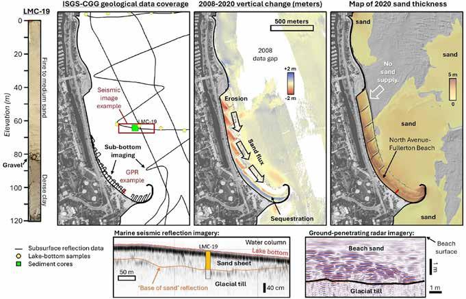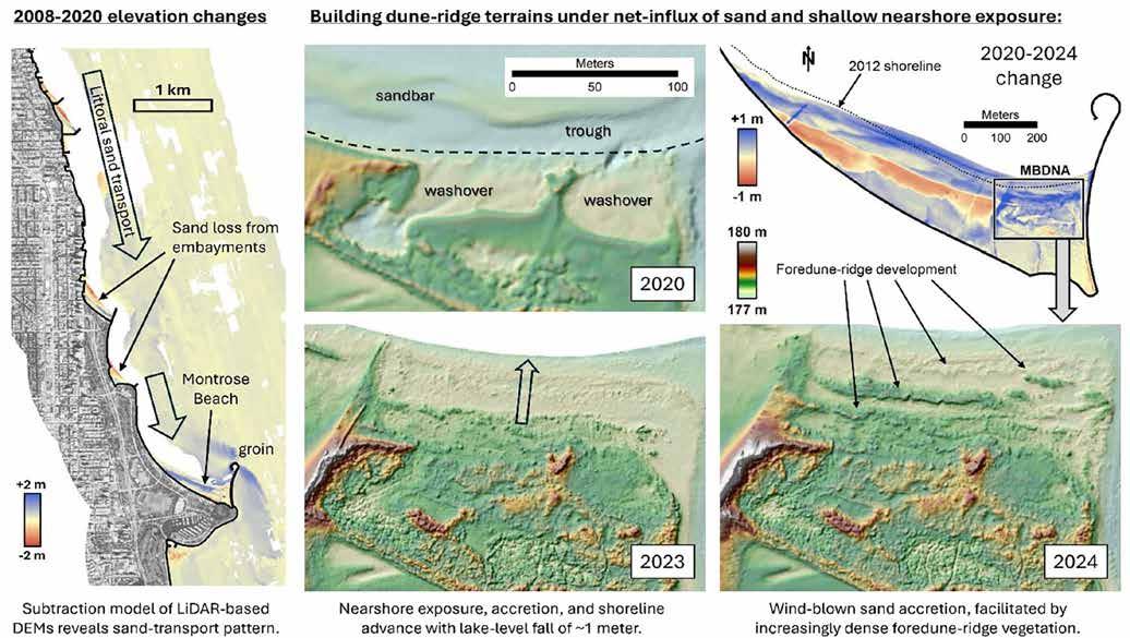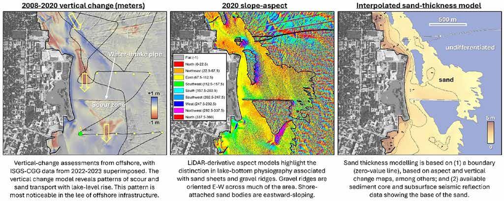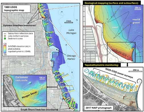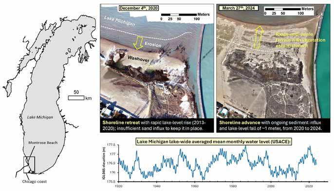 Lake Michigan’s water levels can fluctuate up to two meters over decades, affecting coastal sediments and infrastructure in ways not fully understood. This article highlights findings from offshore sand assessment and beach monitoring along the greater Chicago coast.