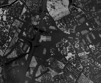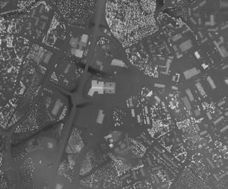 Figure 1: Data about the suburban area (from left to right) shown as a true orthophoto, aerial-image DSM and Lidar DSM.