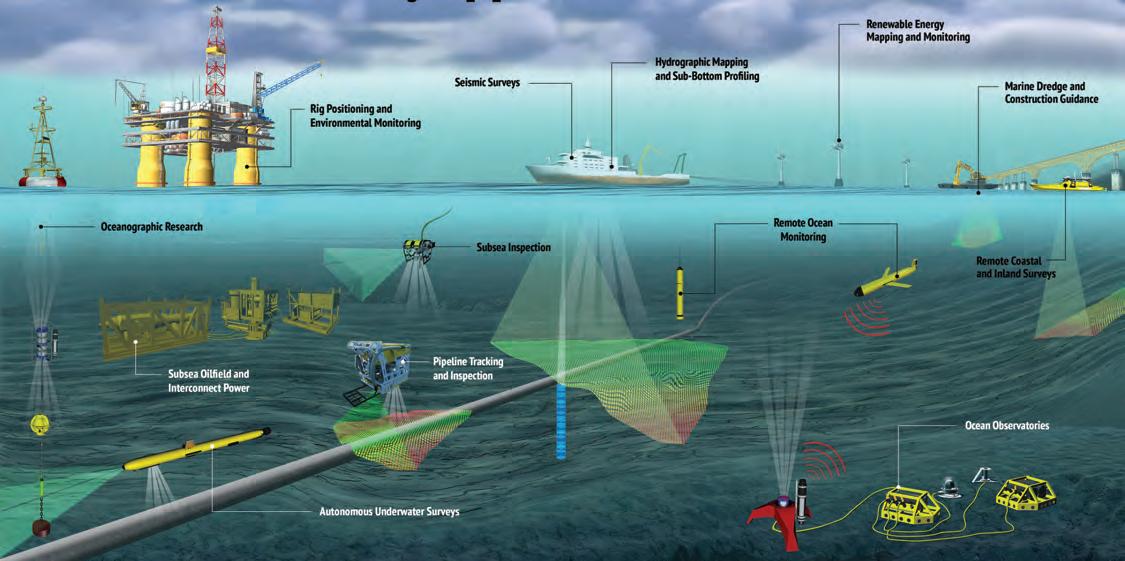 include elevation-derived hydrography, dredging and marine construction support, seafloor mapping, emergency response, reservoir capacity surveys, tidal and river current surveys, tidal gauge analyses, cable and pipeline alignment, geodetic and geophysical surveys, environmental mapping and remediation, marine GIS, object detection and more.