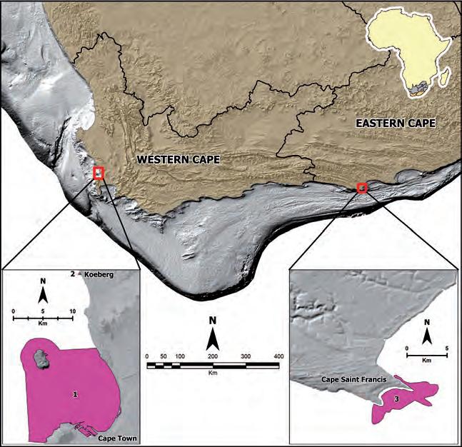 Figure 2: Locality map of Koeberg, and Clifton and Table Bay found along the Western Cape, as well as Cape St Francis found along the Eastern Cape of South Africa.