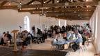 Den store sal i Lammefjordens Besøgscenter kan rumme op til 400. Her er der dækket op til fest.