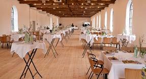 Den store sal i Lammefjordens Besøgscenter kan rumme op til 400. Her er der dækket op til fest.