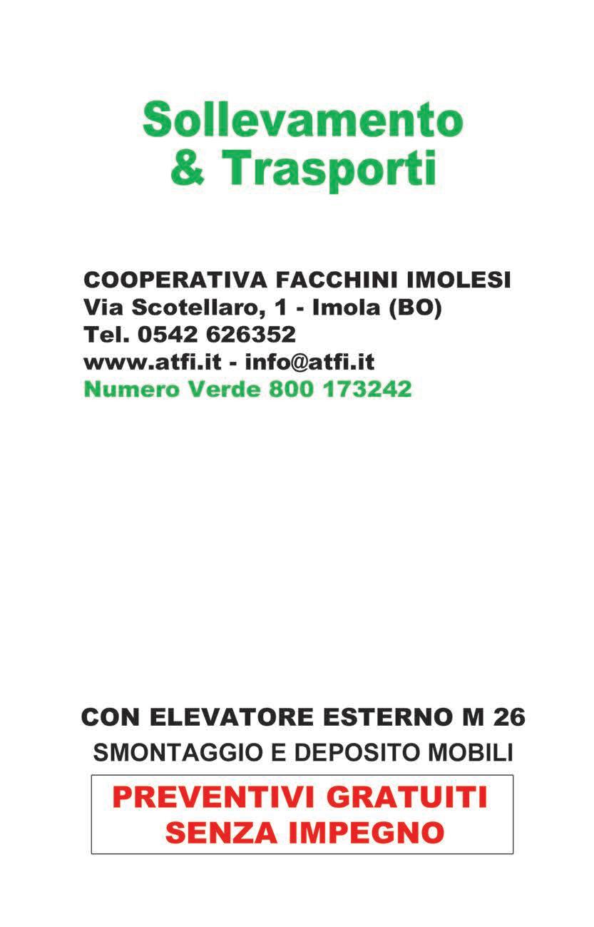 IMOLA 2023 43 G.F. Giovannini Furio di Alessandro Giovannini & C. s.a.s. PRODUZIONE E VENDITA RACCORDI IN OTTONE UNIRAPID PER CONDUTTURE ACQUA 40026 IMOLA (BO) - Via G. Zambrini, 8 Tel. 0542 641776 - Fax 0542 640218 gfraccordi.it G F GIOVANNINI FURIO G F GIOVANNINI FURIO TRASLOCHI NAZIONALI • riadattamento mobili • uffici e negozi • deposito mobili • noleggio autoscala • montaggio di arredamento nuovo di Melfi Salvatore Ufficio e deposito: Via I Maggio, 34 - 40026 Imola (BO) Contatti: Tel. 0542 640125 - Cell. 339 8329598 amministrazione@3mtraslochi.it