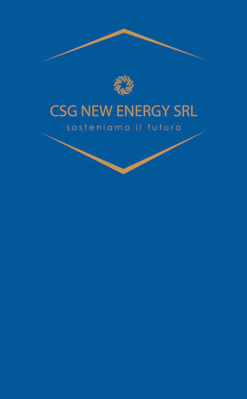 • IMPIANTI ENERGIE RINNOVABILI • IMPIANTI TECNOLOGICI • IMPIANTI CIVILI E INDUSTRIALI • IMPIANTI DOMOTICI • IMPIANTI TVCC ANTI INTRUSIONE • AUTOMAZIONE E CABLAGGIO STRUTTURALE CSG NEW ENERGY SRL Via Cavour, 14 - Leini (TO) Andrea Casula Amministratore Unico Cell. +39 338 2612950 Pierantonio Siclari Responsabile Amministrativo Cell. +39 335 6774213 Paolo Grano Responsabile Tecnico Cell. +39 351 7891449 csgnewenergysrl@gmail.com pec@pec.csg-newenergysrl.it www.csg-newenergy.it