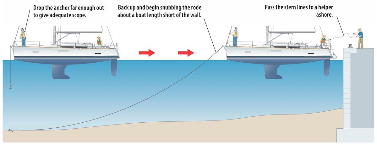 THE FIRST TIME I CRUISED THE MED , Med-mooring, mooring stern-to with an anchor off the bow, seemed foreign and difficult compared to just anchoring. But, many Med harbors are tight and often crowded with cruising and fishing boats so stern-to mooring against a stone quay provides a space-efficient, stable configuration that also provides an easier way to get ashore.