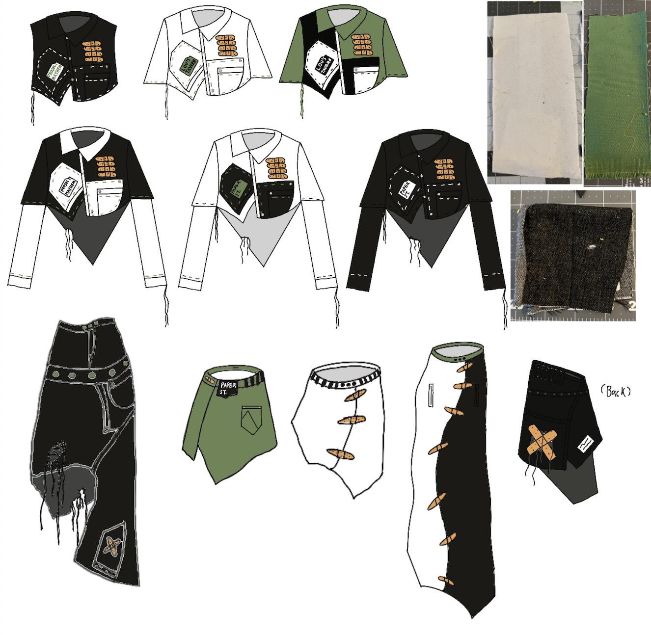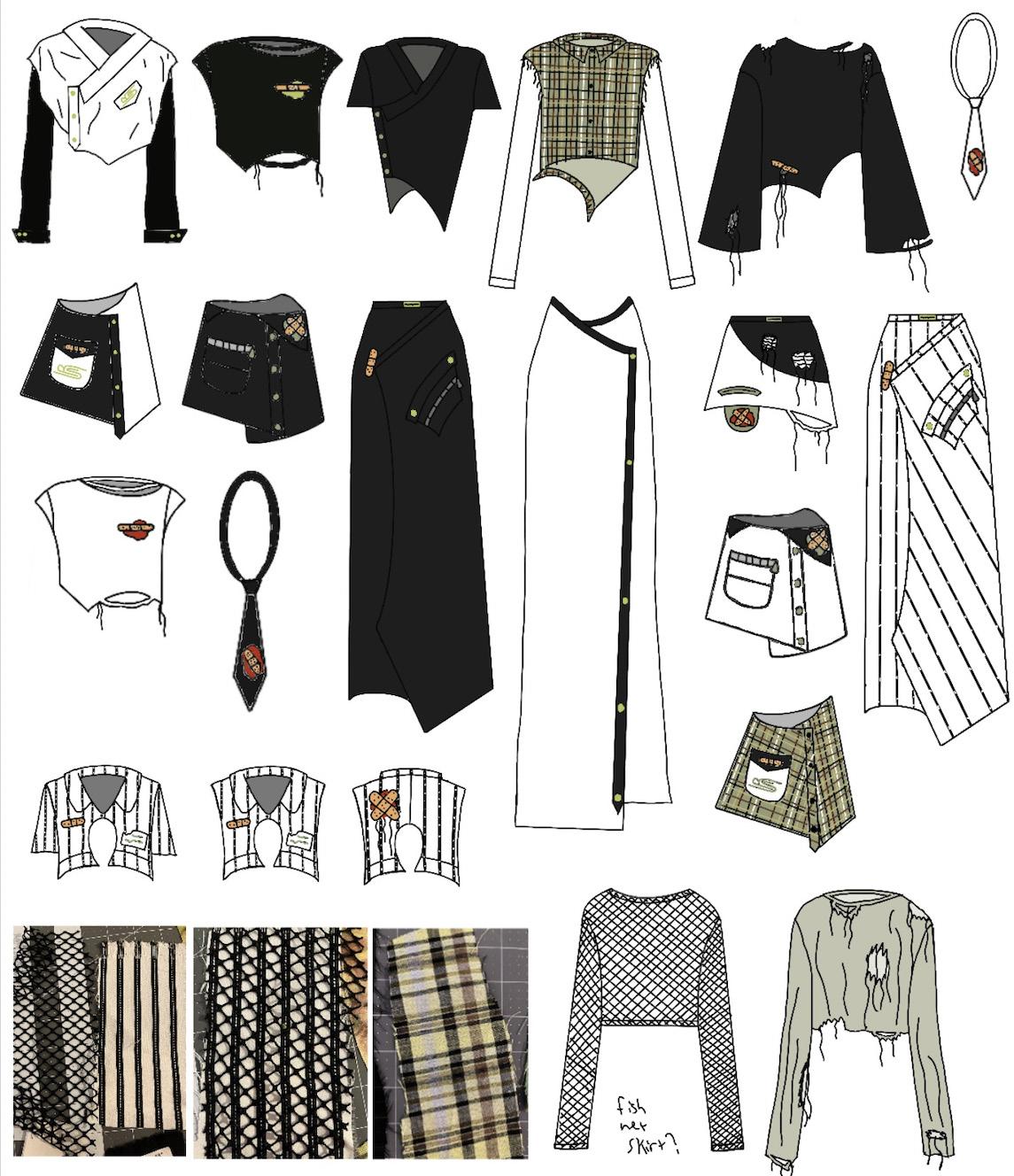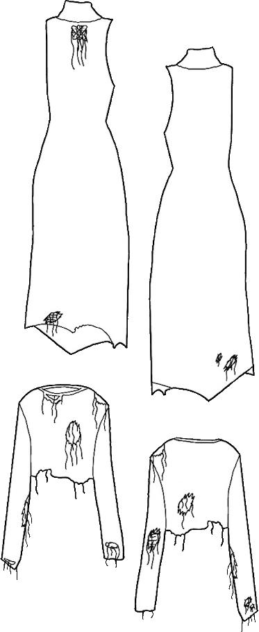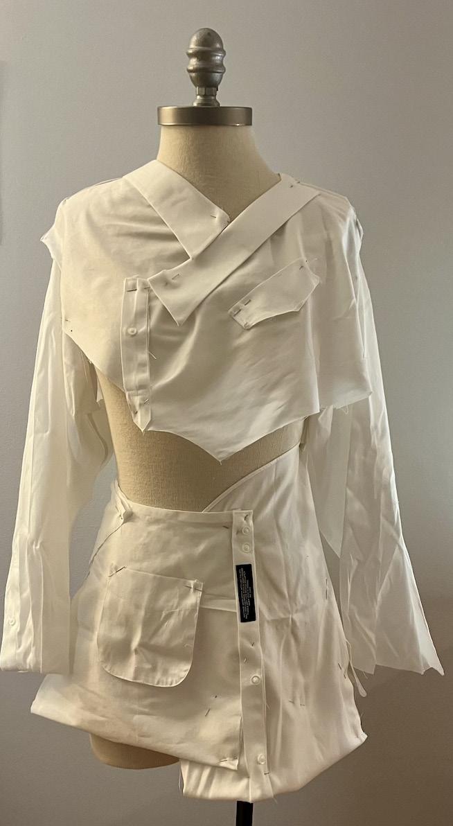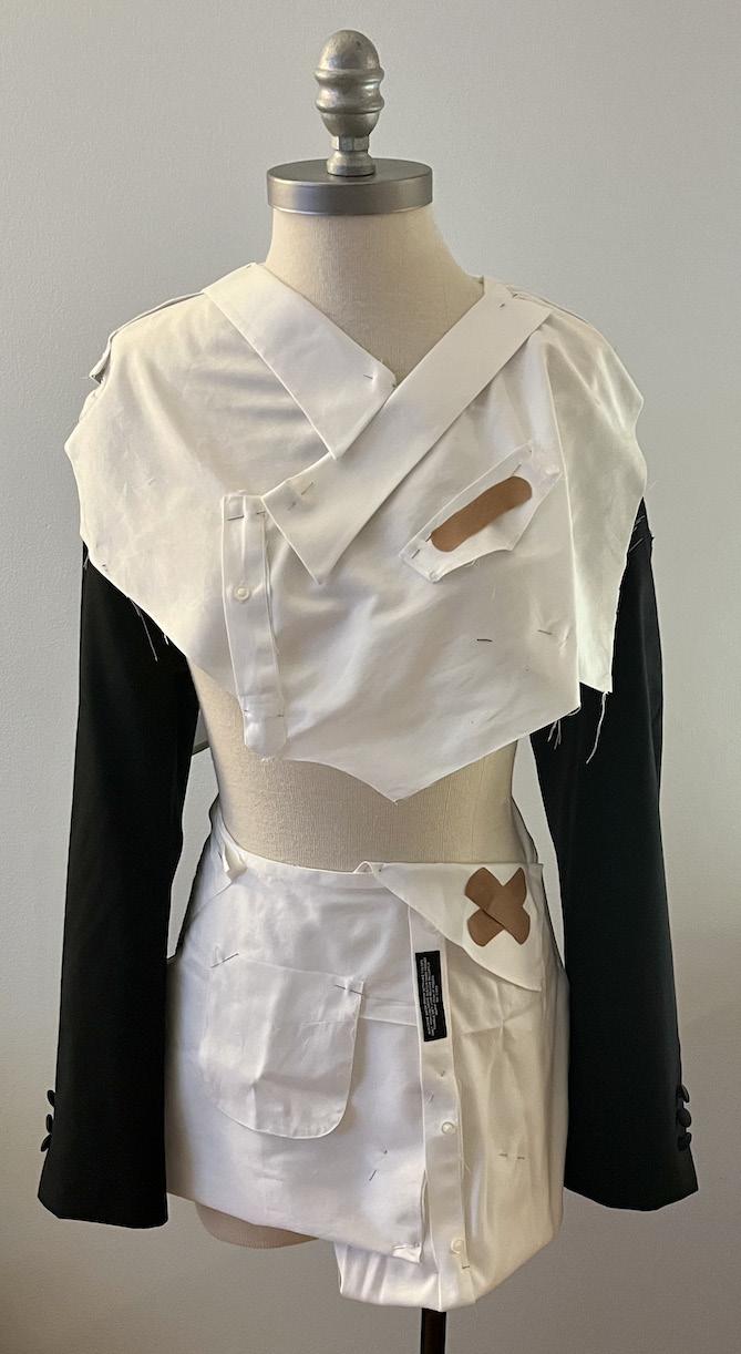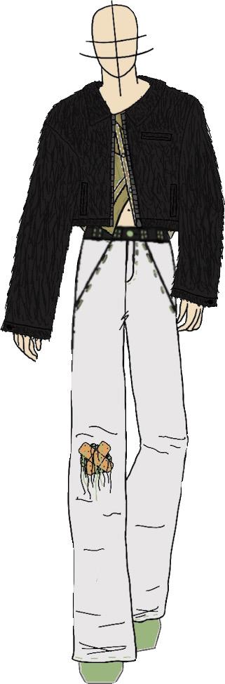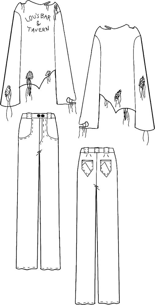 this collection takes a look at the film “fight club” and how the characters circum to radical solutions; from self-destruction, dilusion, anti-consumerism violence, and more. i chose to take on design problems and creations through radical solutions like the narrarator / jack does in the film. i chose to thrift 4 basic garments to take apart. the characters rid themselves of all possessions so then they are free to do anything they desire. i took this mindset when stripping apart the garment so then i can create as freely as possible using the garments. i decided to drape the looks with these four basics i thrifted as well as use obscure references from the film that real fans would notice and understand the origin of a graphic or text; as well as be able to connect the themes.
