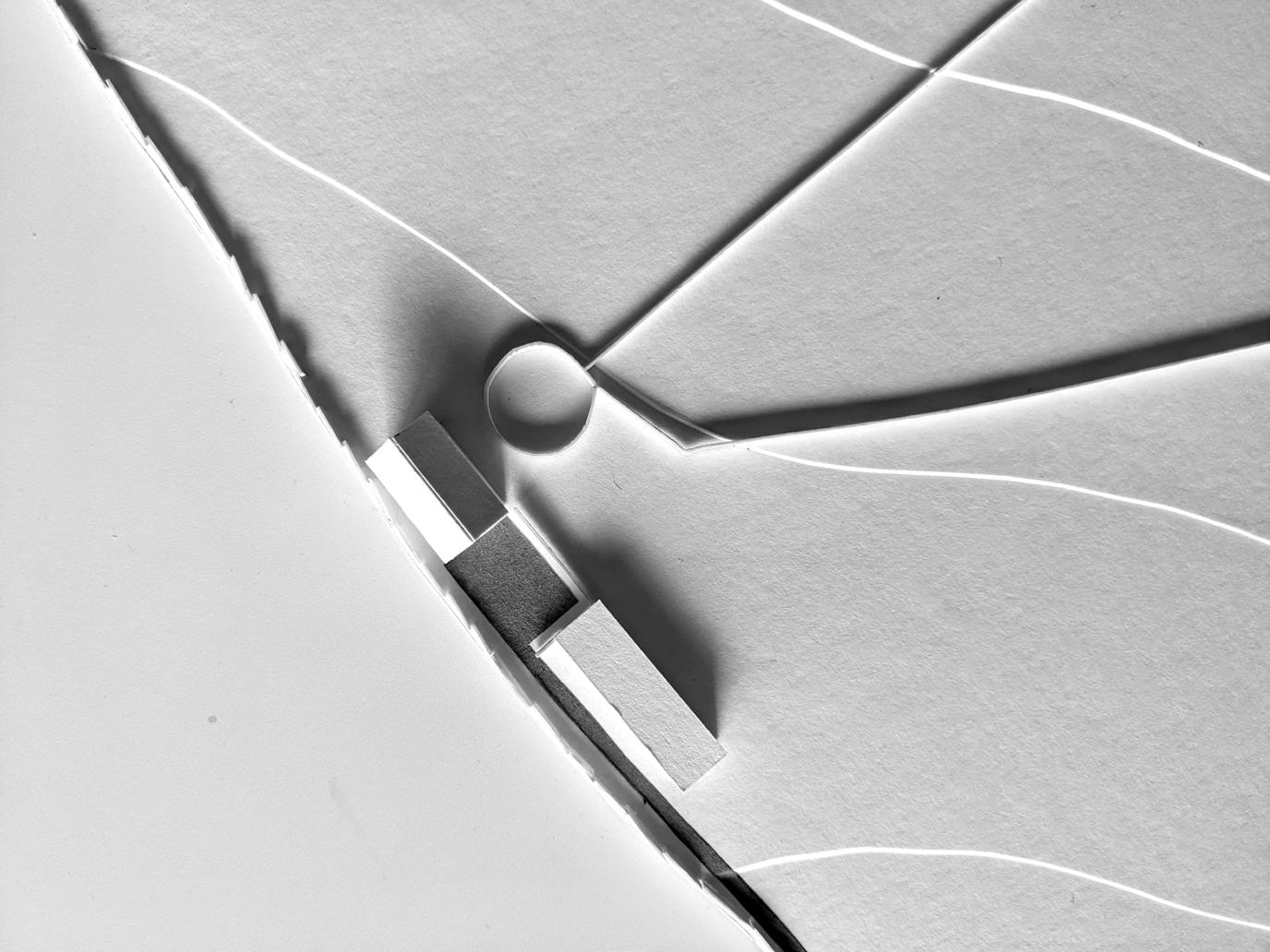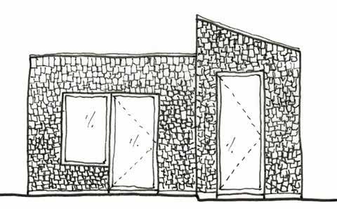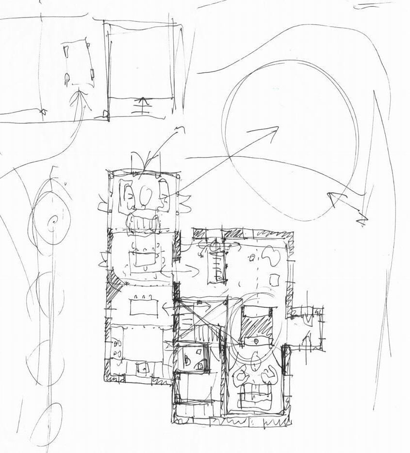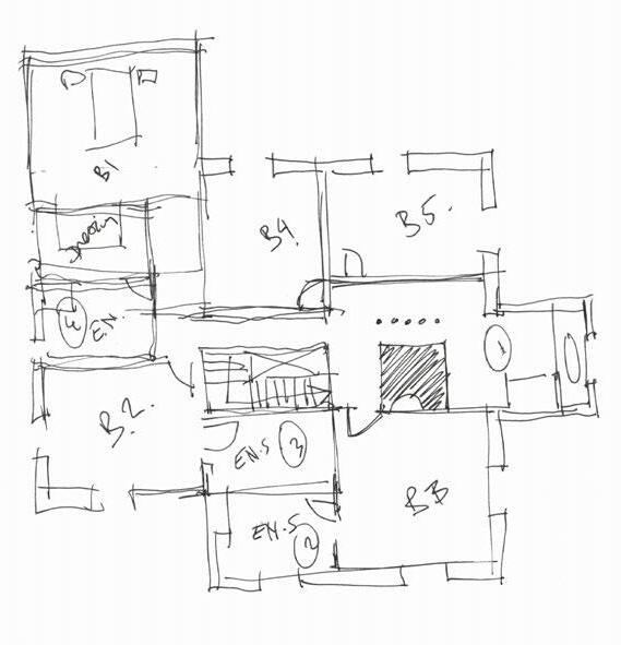 Wire frame sketch showing the new stair well defning the entrance with a new central stair leading up to the new bridge connecting the North and South blocks