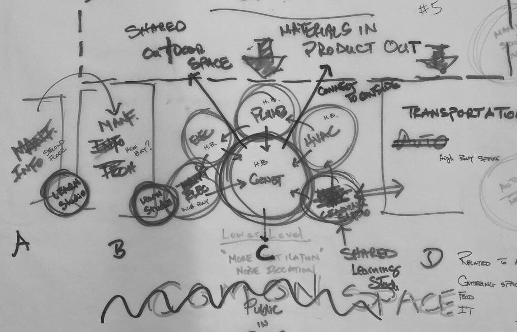 Inspiration for materials/design consists of more organic/natural materials with a hint of industrial materials to reflect the industrial nature of certain programs.