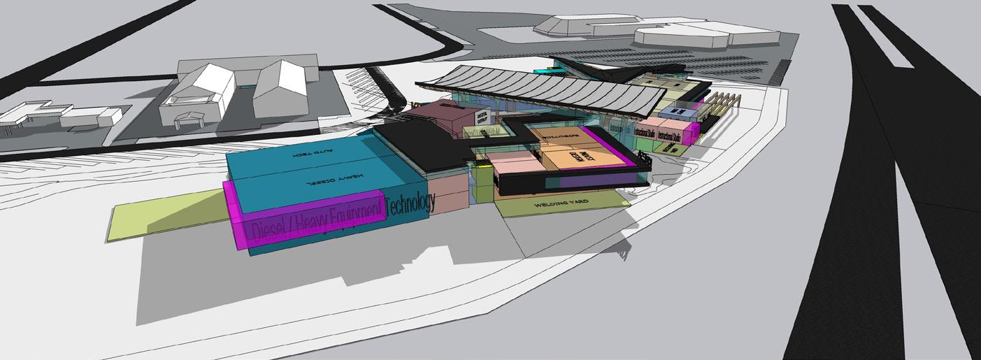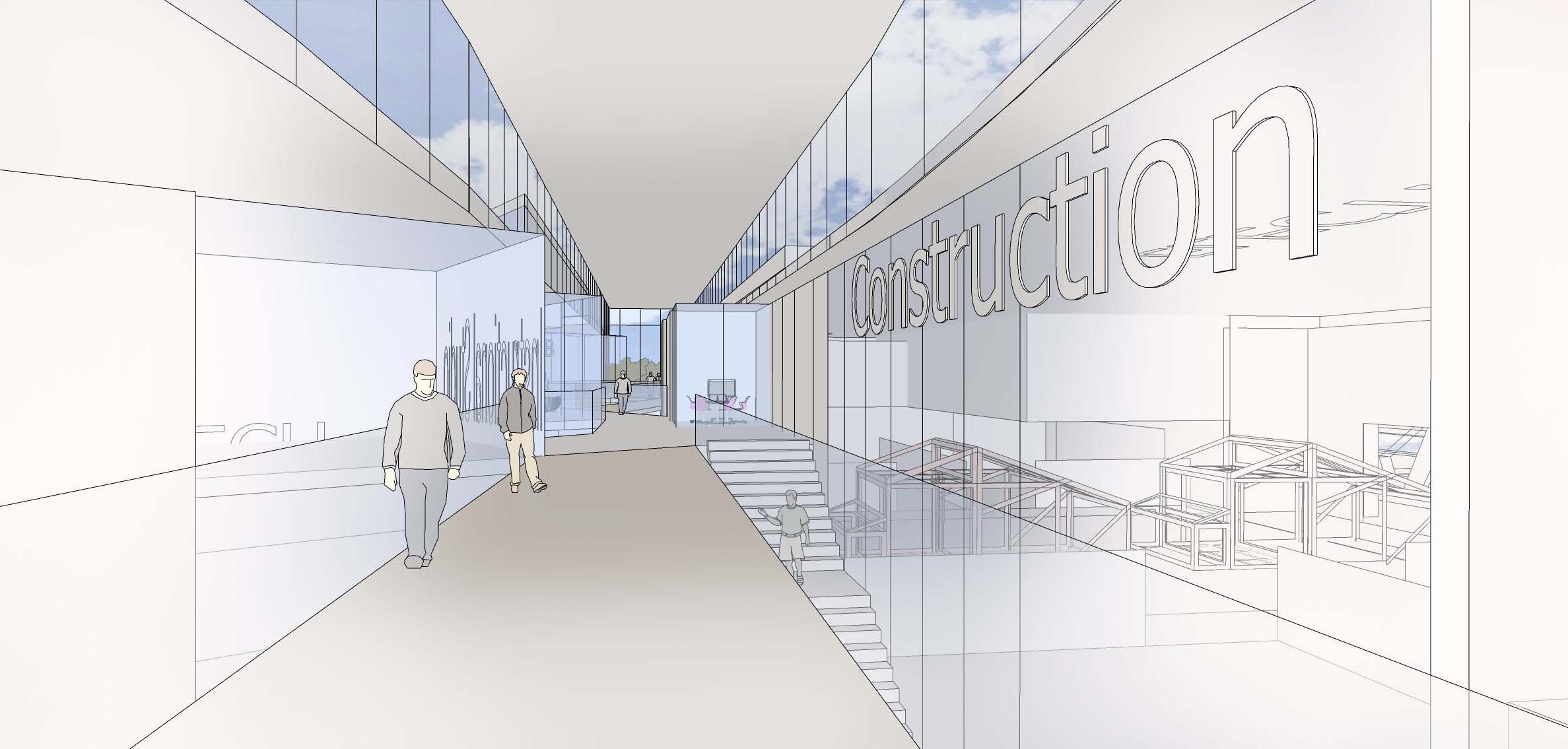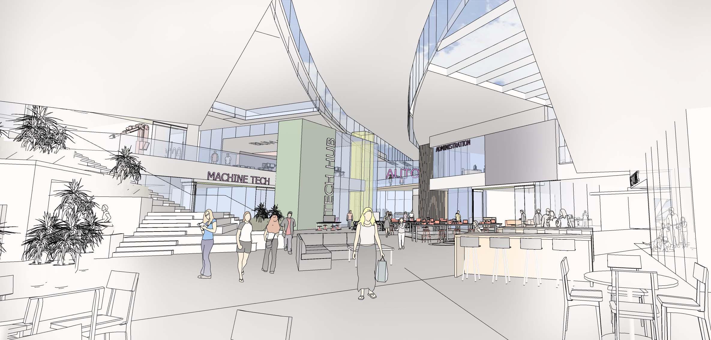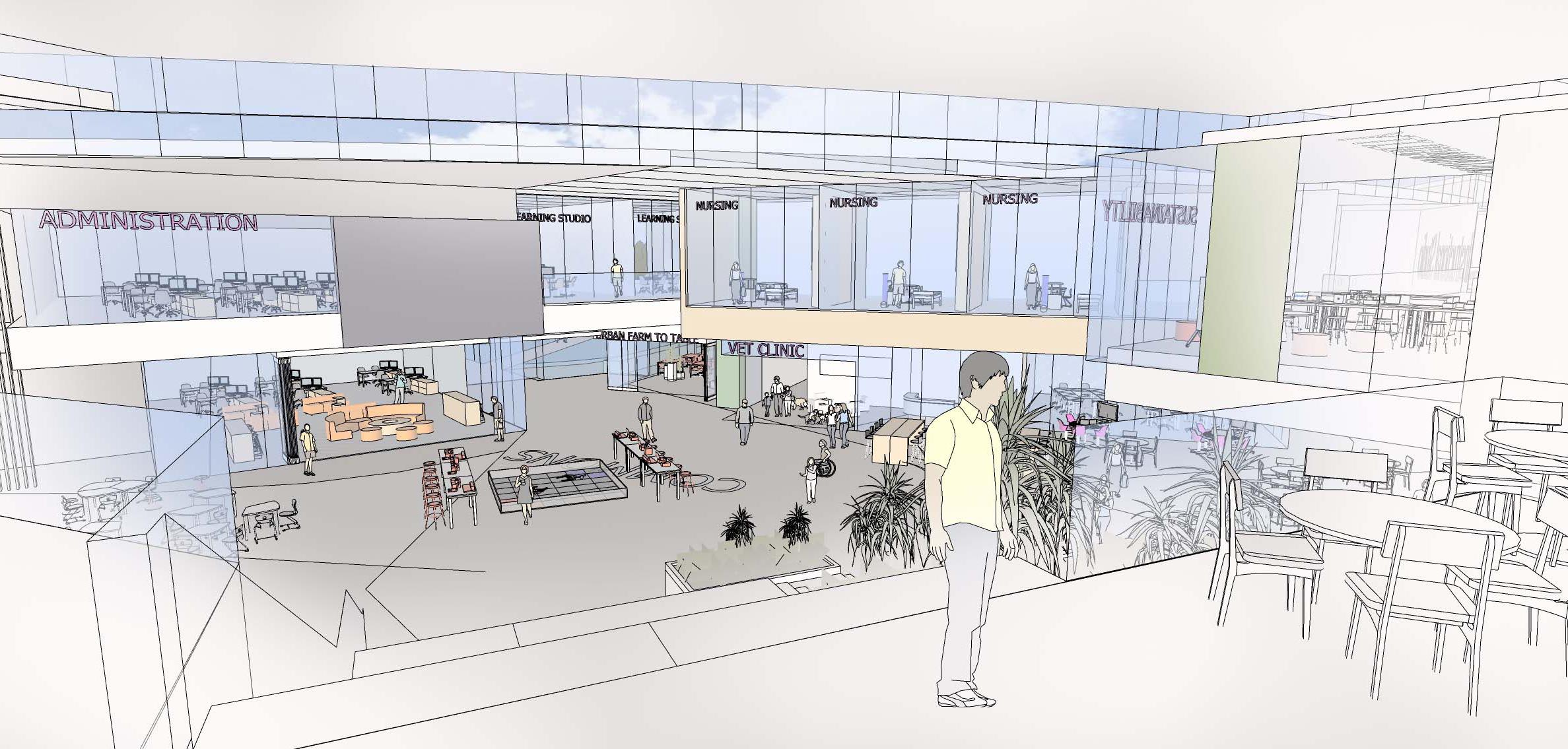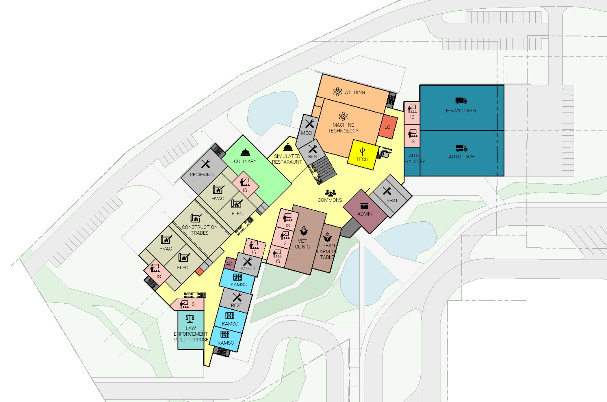 Our approach to overall layout consists of looking at the building from both outside-in and inside-out. Starting with the main entry, close consideration is given to separate different types of traffic flow on the site, maximizing circulation and safety. An emergency and service flow loop road/driveway around the building will be critical for the operation of the facility. Looking from the inside-out, the commons space is the ‘glue’ that holds the building together, allowing for accidental collisions among the pathways creating an innovative learning experience. Finally, ‘future-proofing’ is a critical aspect allowing expansion on the site and creating flex-learning studios from within the building that can be adapted into other pathways as requirements will change over time.