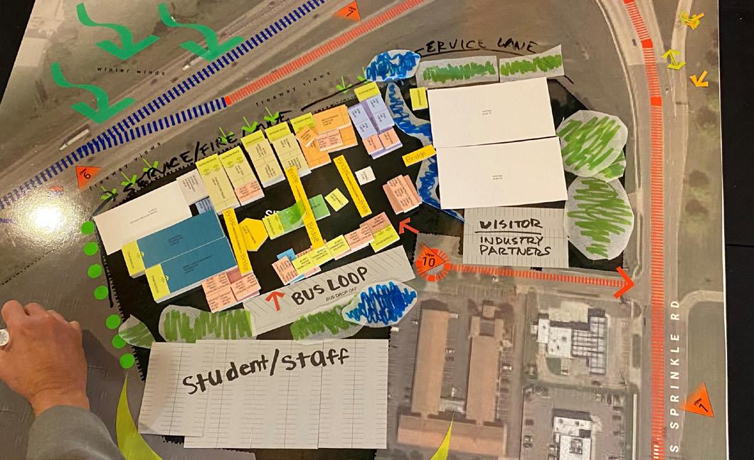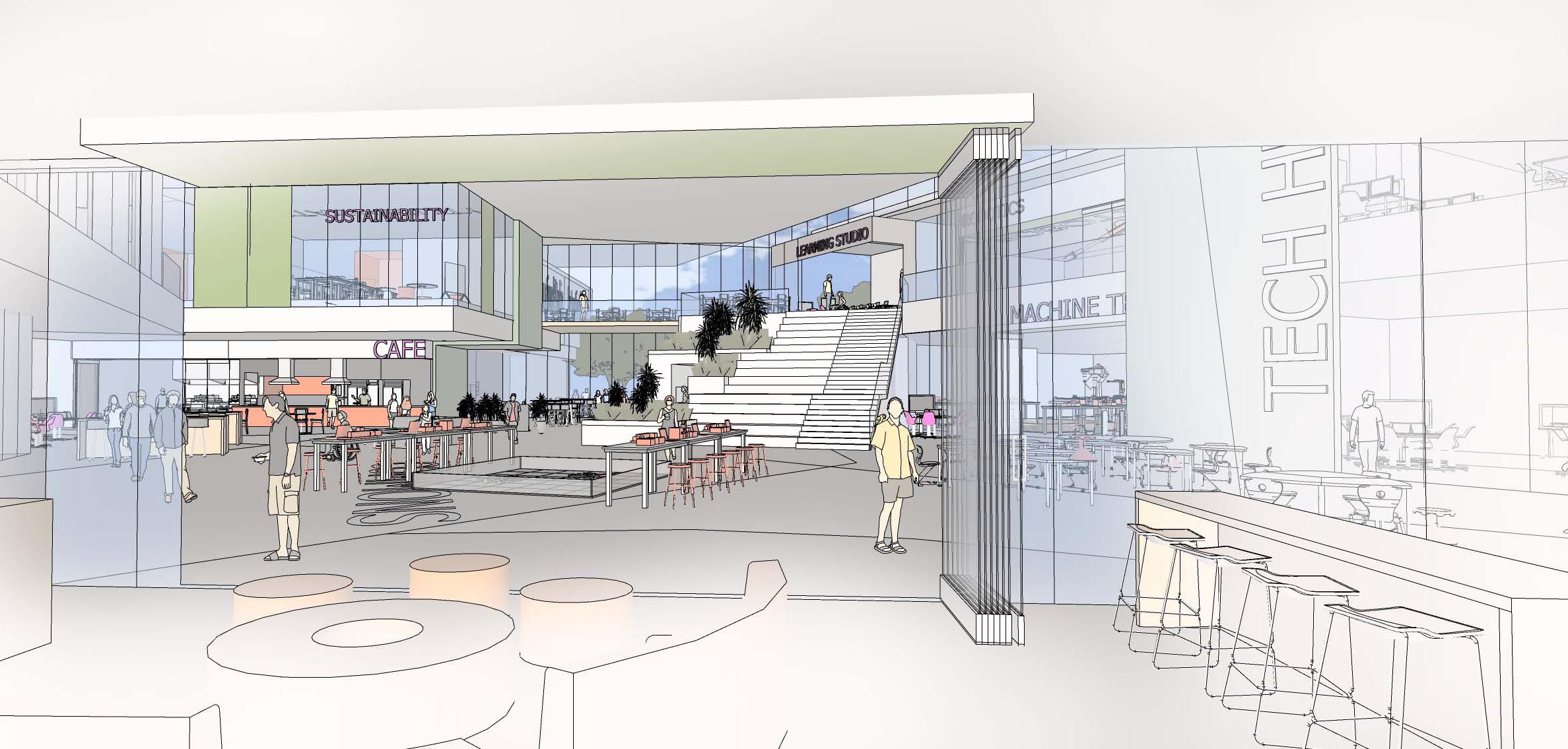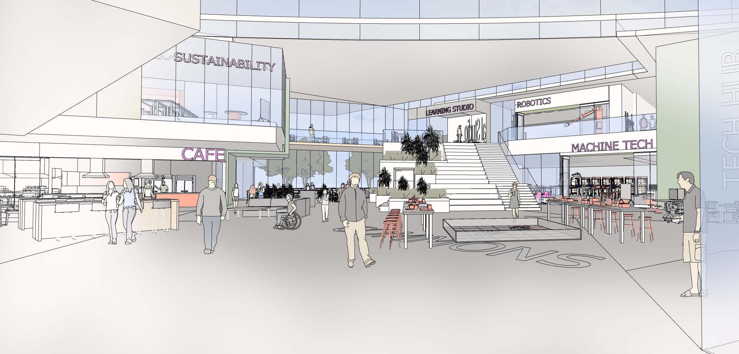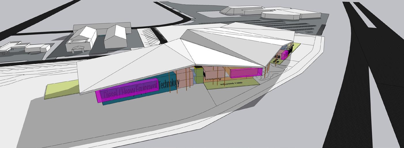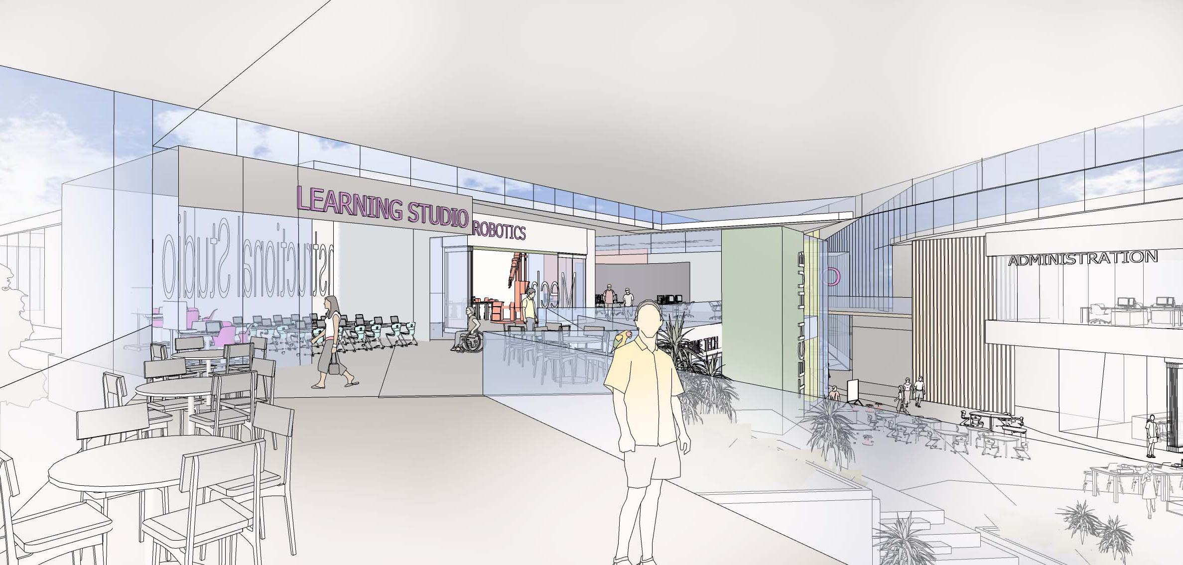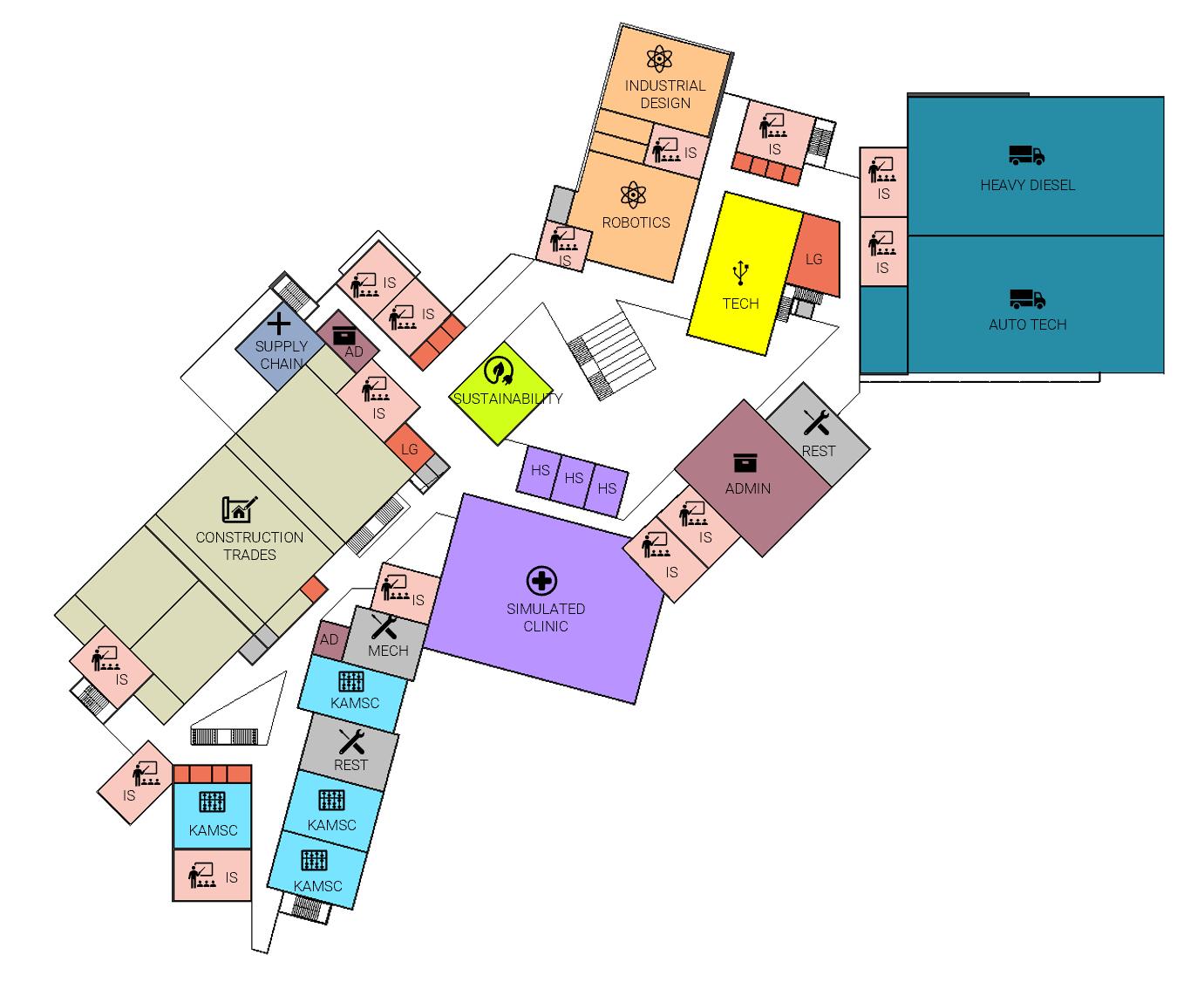 Our approach to overall layout consists of looking at the building from both outside-in and inside-out. Starting with the main entry, close consideration is given to separate different types of traffic flow on the site, maximizing circulation and safety. An emergency and service flow loop road/driveway around the building will be critical for the operation of the facility. Looking from the inside-out, the commons space is the ‘glue’ that holds the building together, allowing for accidental collisions among the pathways creating an innovative learning experience. Finally, ‘future-proofing’ is a critical aspect allowing expansion on the site and creating flex-learning studios from within the building that can be adapted into other pathways as requirements will change over time.