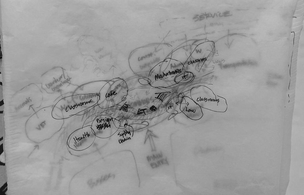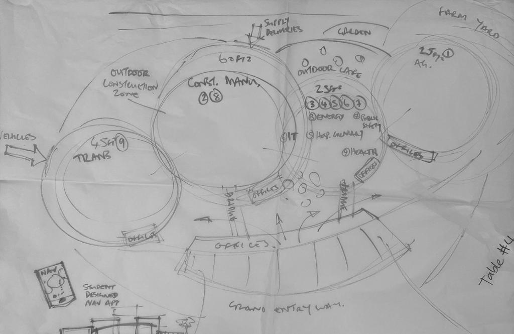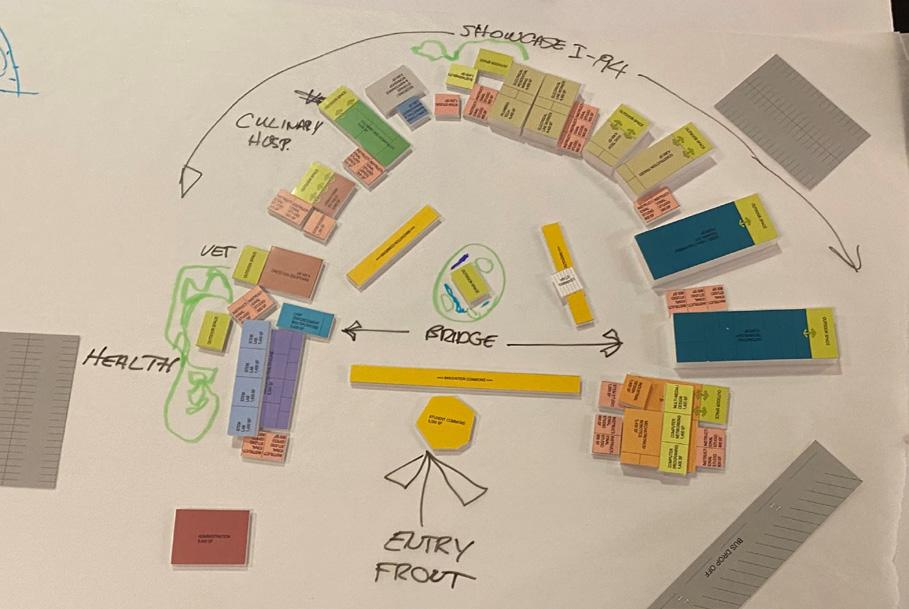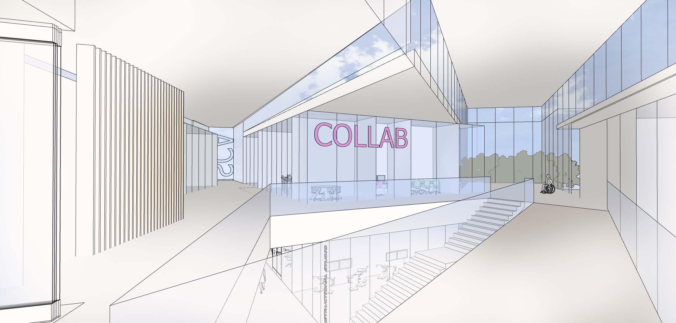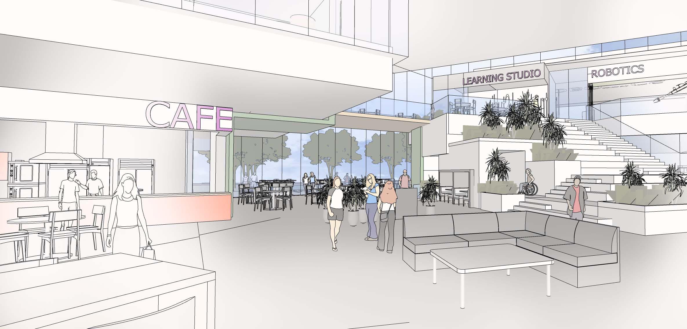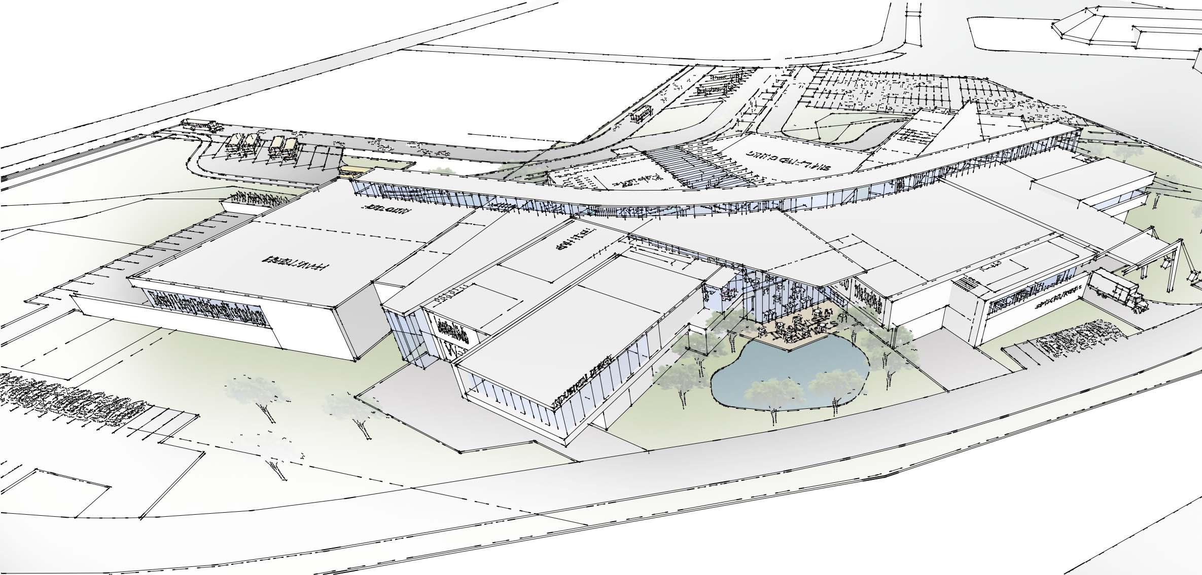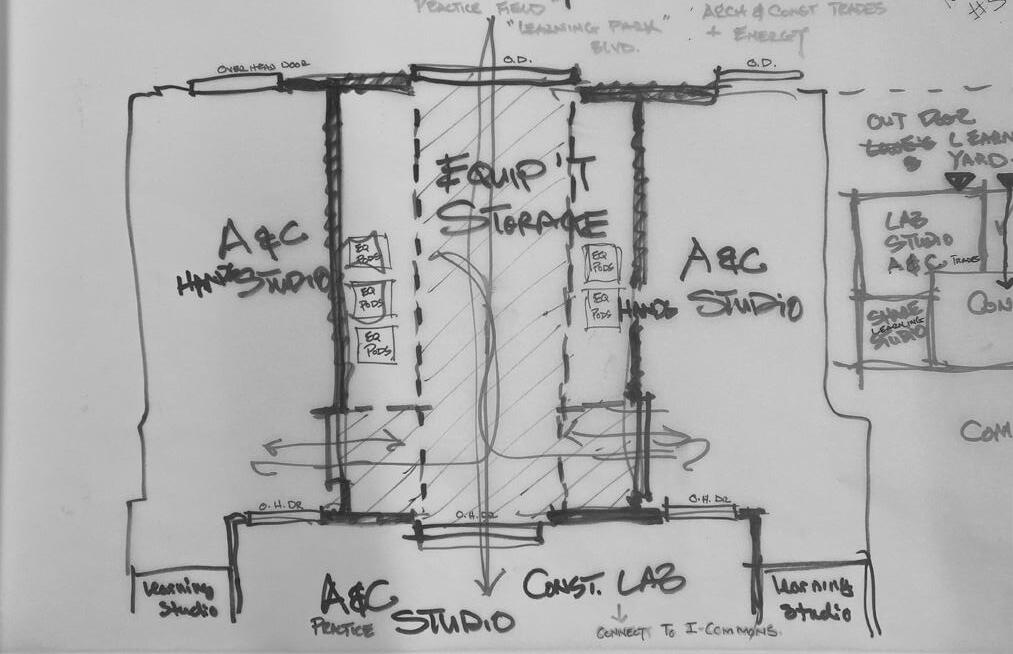 Our approach to overall layout consists of looking at the building from both outside-in and inside-out. Starting with the main entry, close consideration is given to separate different types of traffic flow on the site, maximizing circulation and safety. An emergency and service flow loop road/driveway around the building will be critical for the operation of the facility. Looking from the inside-out, the commons space is the ‘glue’ that holds the building together, allowing for accidental collisions among the pathways creating an innovative learning experience. Finally, ‘future-proofing’ is a critical aspect allowing expansion on the site and creating flex-learning studios from within the building that can be adapted into other pathways as requirements will change over time.