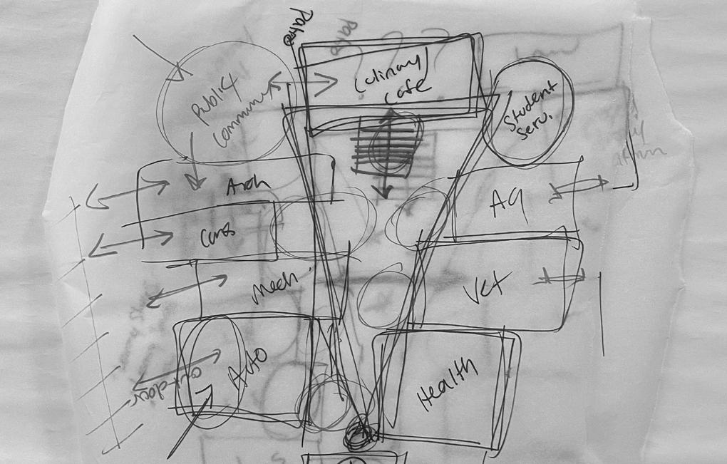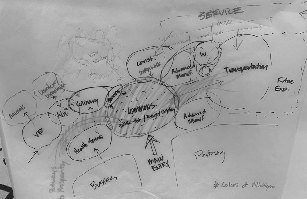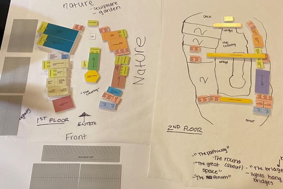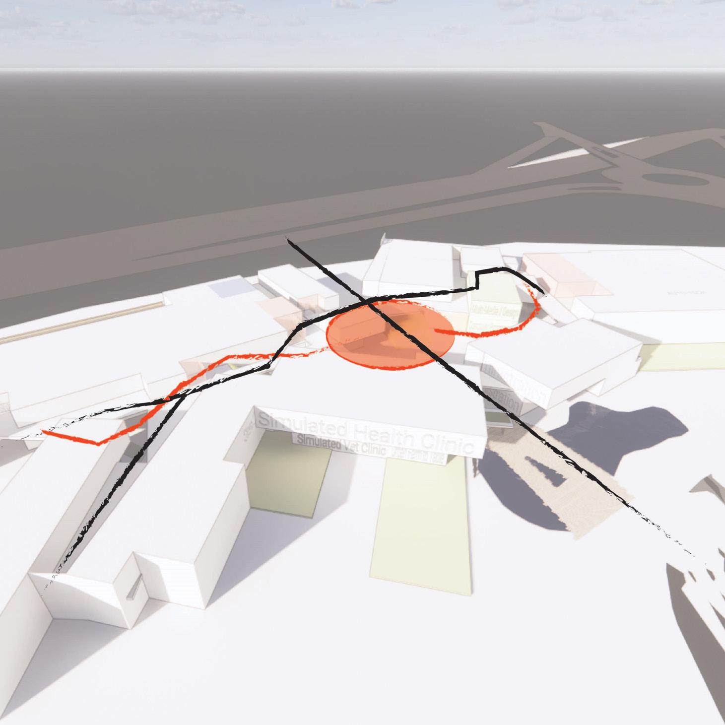 Discovery Trail is the architectural concept in which the Kalamazoo CTE Center becomes a trail of discovery & learning. The concept allows the building to have an entry into the “trailhead,” which is highlighted in red. The “trailhead,” also known as the “commons,” will have trails & bridges (as seen in trails in the natural environment) that guide users through the building program. The commons becomes the central feature that gives a moment of relief and familiarity. While the trails guide users throughout the building (also known as their pathways). The trail consists of non-linear, more organic flow through the building to reflect the meandering trails in real-life nature.